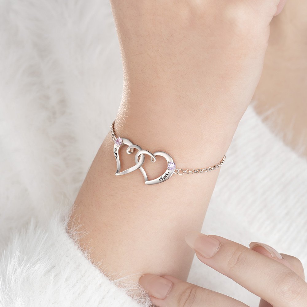 Personalized Interlocking Double Heart Sterling Silver Bracelet with Birthstones and Engraved Names Valentine's Day Anniversary Gift for Women