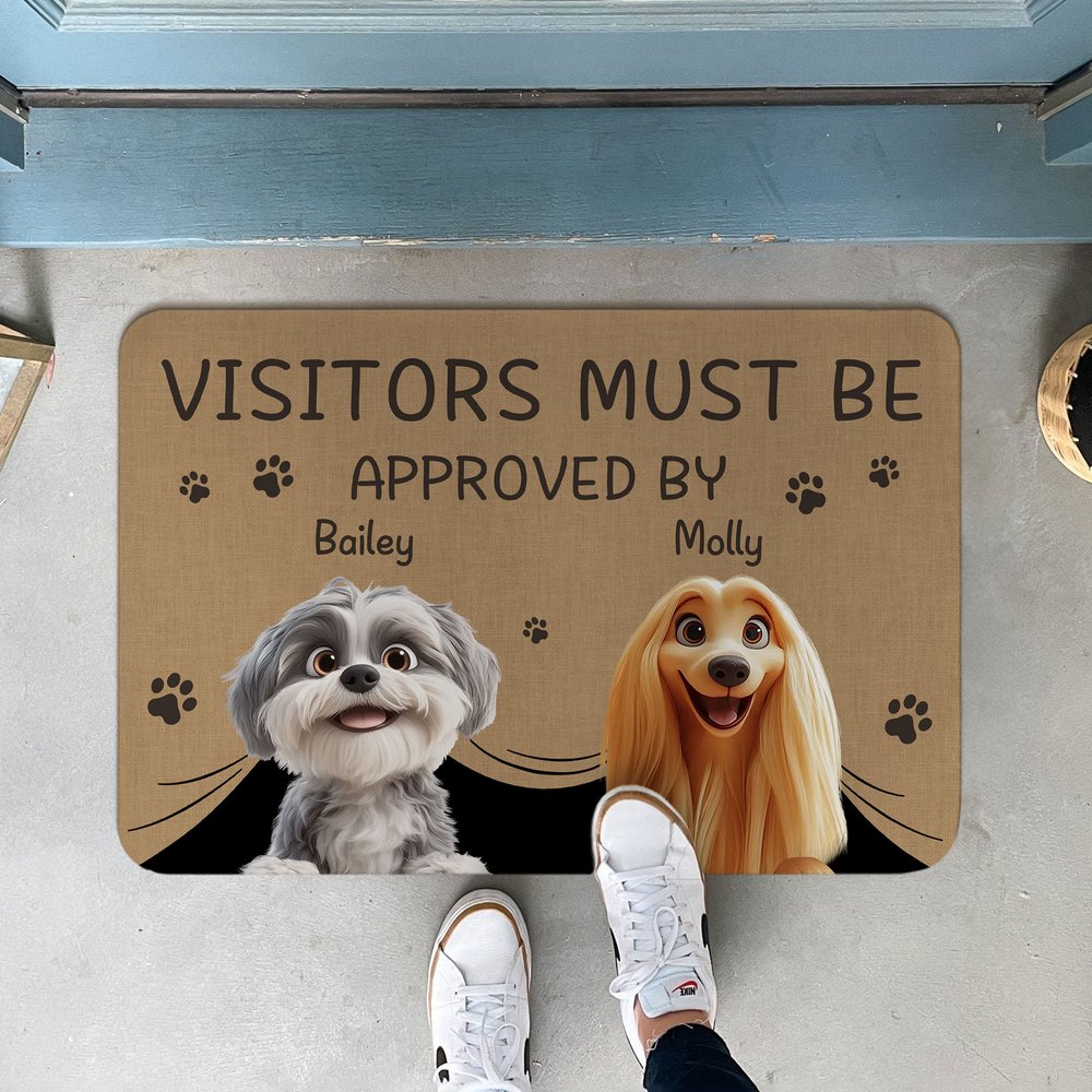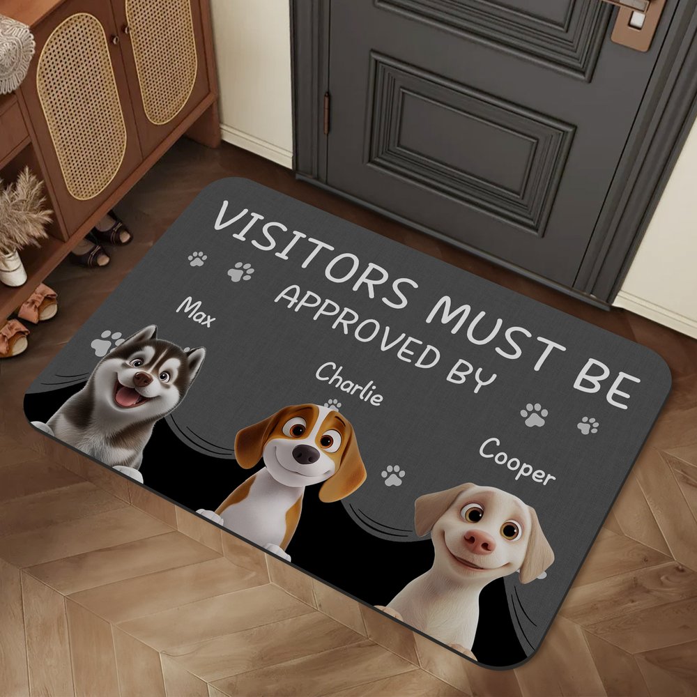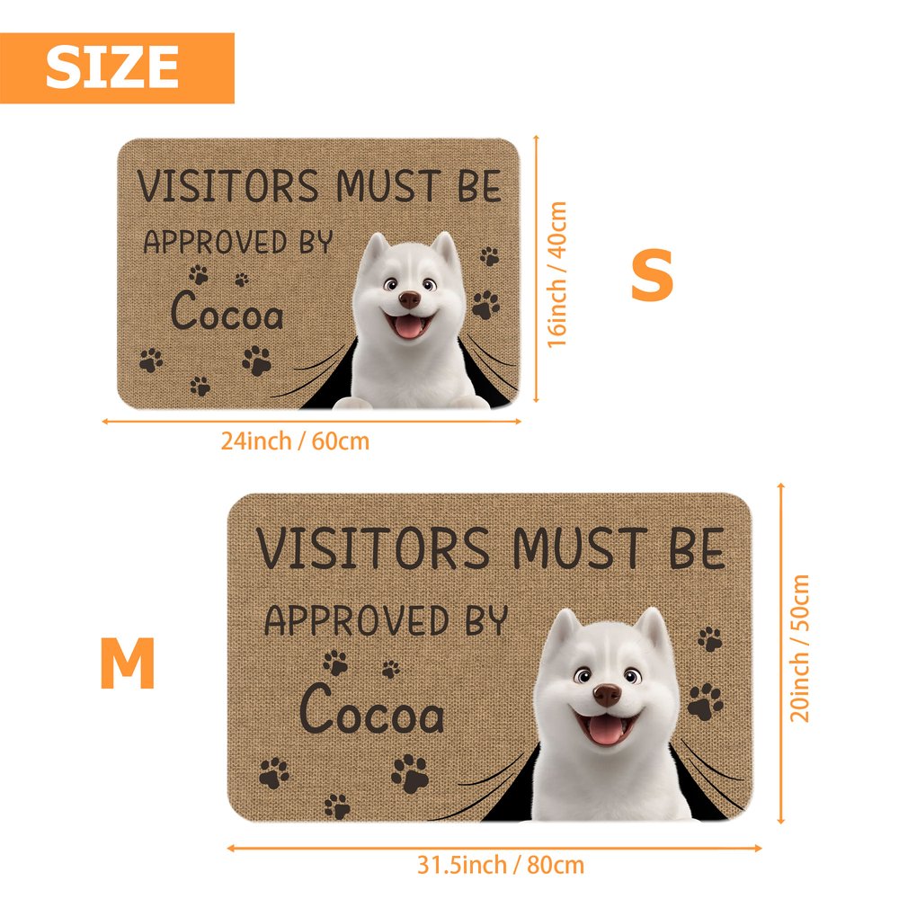 Featuring a cute 3D cartoon portrait of your dog, paired with the playful phrase "VISITORS MUST BE APPROVED BY" and adorable paw prints, this doormat instantly brings life to your entryway. Personalize it with your pet’s name to turn your furry friend into the official "little guard" of your home—adding a unique touch of warmth and personality.