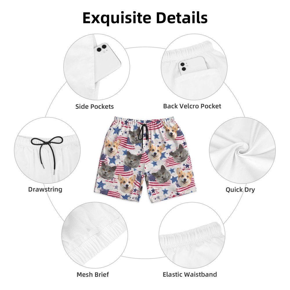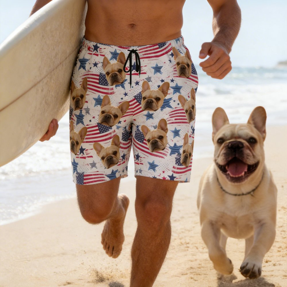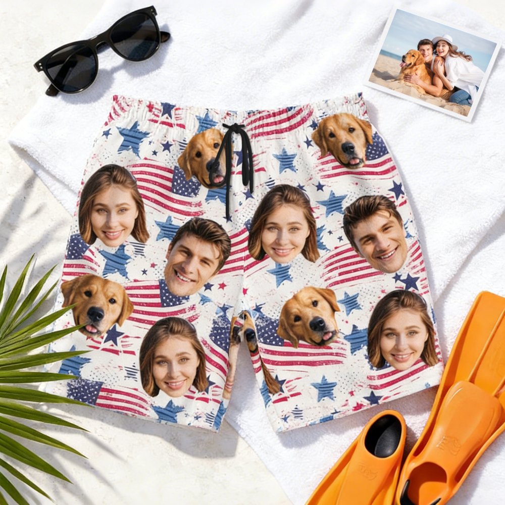 Med det amerikanske uavhengighetsdagsflagget som det viktigste designelementet, som kan tilpasses med ditt portrett, har denne strandshortsen en slående amerikansk stil som kombinerer ferieglede med et personlig preg, noe som gjør den iøynefallende og svært individualistisk.