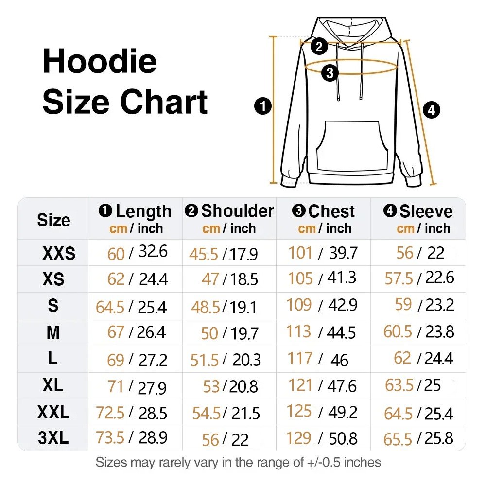 | Measurement: | T-shirt - XXS, XS, S, M, L, XL, 2XL, 3XL, 4XL, 5XL Hoodie - XXS, XS, S, M, L, XL, 2XL, 3XL |
