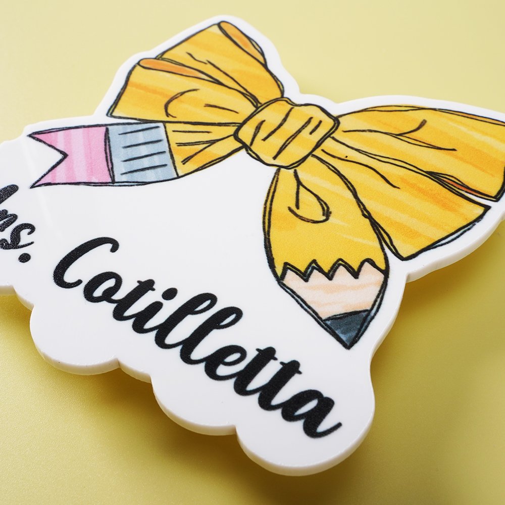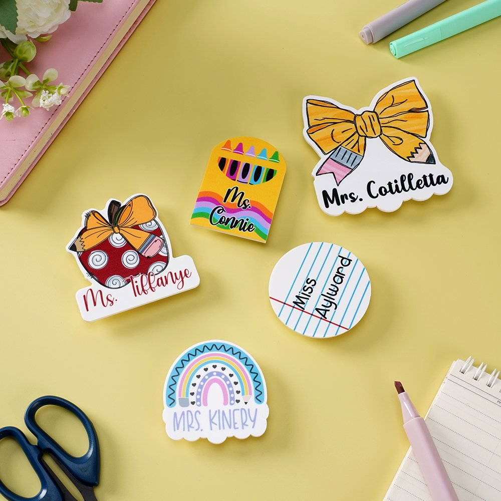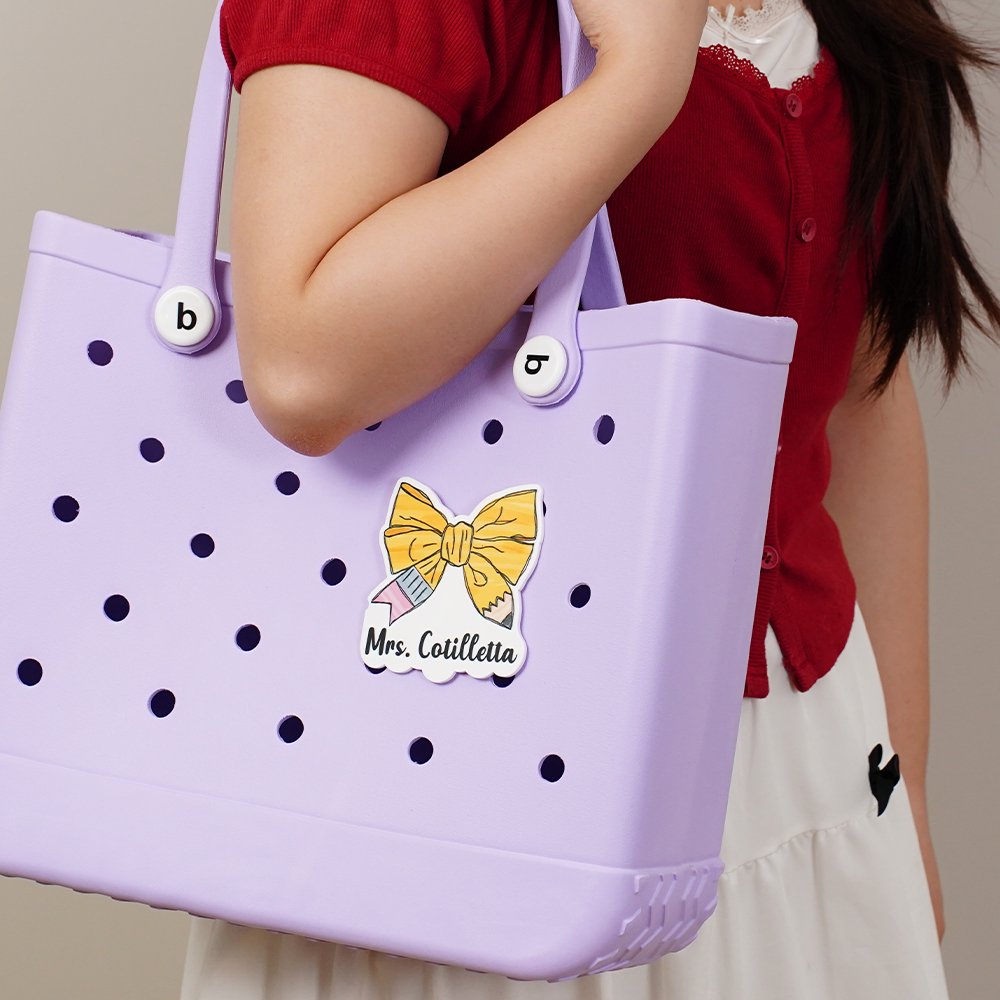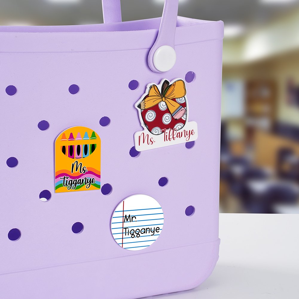 Our lightweight and compact design ensures that this personalized accessory won't weigh you down, and can be easily hung from a bag, backpack, or anything with a hole in it for easy portability. The 3D-printed customization element not only adds an element of personalization, but it also enhances the bag's recognizability, making it easy to identify it amongst the many that can be used as the finishing touch to a teacher's outfit, whether it be for the classroom or the cafeteria.
