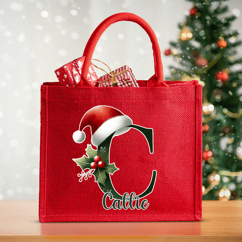 The personalized jute red tote bag perfectly captures the essence of the Christmas season. It features a classic Christmas-themed lettering at its heart, and personalized naming is available, making each gift a unique and personal surprise. The classic red color, accented with Christmas-themed lettering adorned with bells and snowflakes, exudes a rich, warm, festive atmosphere.