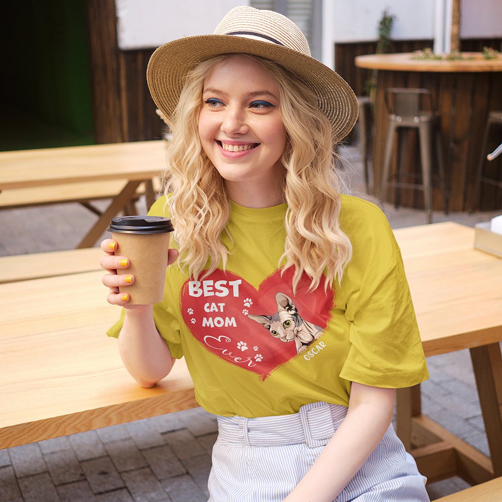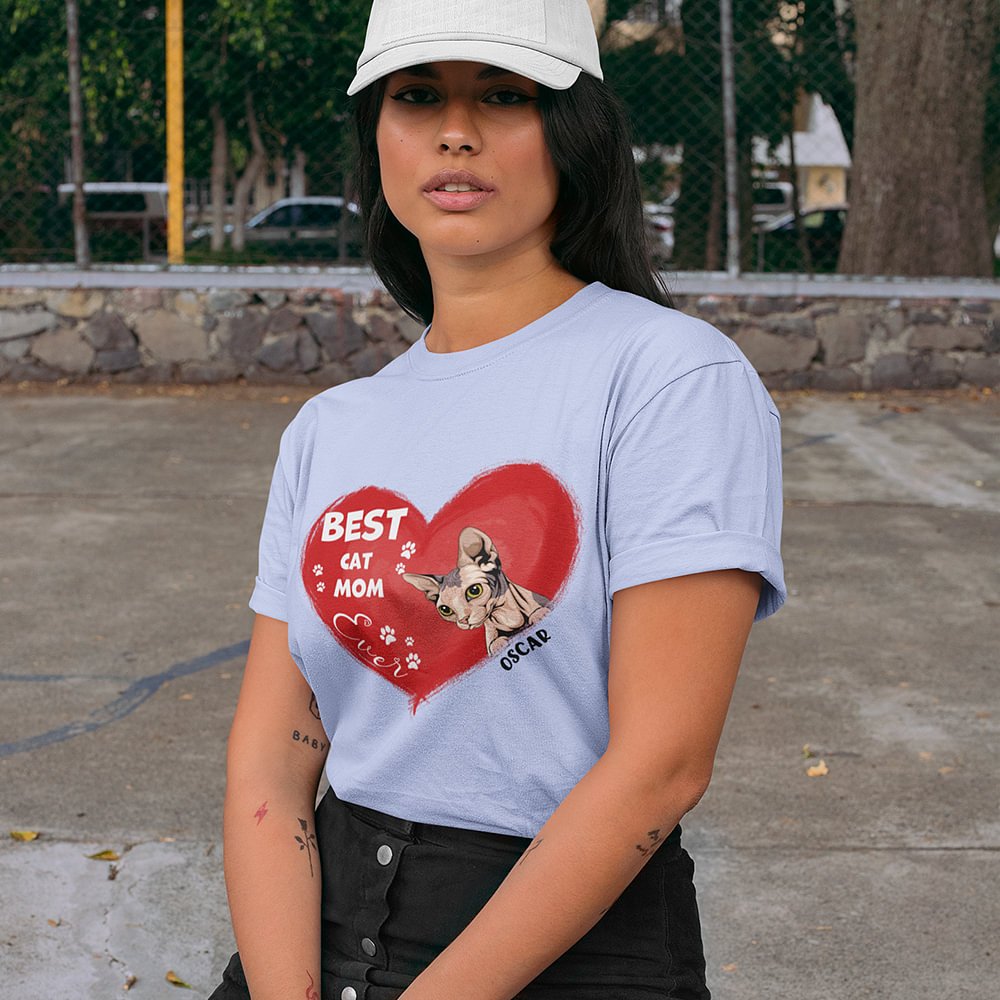 This pet t-shirt is designed as a personalized gift for people who have a deep love for their furry companions. The front of the t-shirt features a red heart and the phrase "Best Cat Mom Ever," along with an adorable image of a pet. You can choose a pet's breed and customize its name, expressing your affection for your beloved pet. This makes it a perfect gift to commemorate special occasions or show appreciation between friends.