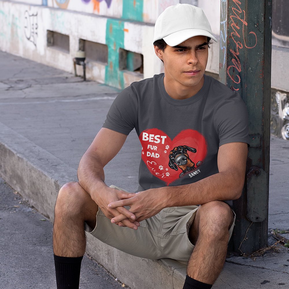 This pet t-shirt is designed as a personalized gift for people who have a deep love for their furry companions. The front of the t-shirt features a red heart and the phrase "Best Fur Dad Ever," along with an adorable image of a pet. You can choose a pet's breed and customize its name, expressing your affection for your beloved pet. This makes it a perfect gift to commemorate special occasions or show appreciation between friends.