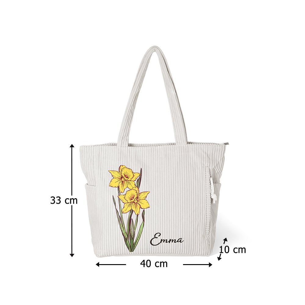 Dette designet er sentrert rundt det eksklusive fødselsblomst-motivet og kombineres med personlig navnetilpasning. Den milde og elegante stilen gir en følelse av personlig ritual som treffer den feminine estetikken perfekt. Kordfløyel-stoffet gir en naturlig vintage-tekstur som løfter den hverdagslige vesken til et unikt tilbehør, og forener visuell skjønnhet med personlig betydning.