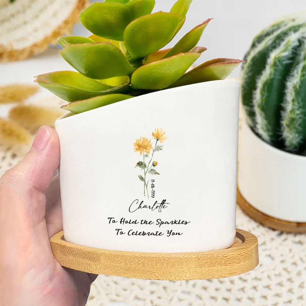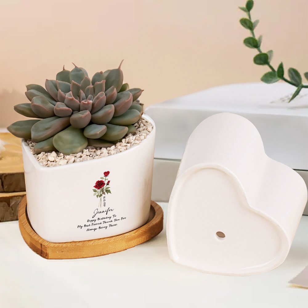Personalized Birth Flower Heart-Shaped Name Ceramic Plant Pot with Date and Drainage Bamboo Base Home Decor Birthday Gift for Gardening Lovers