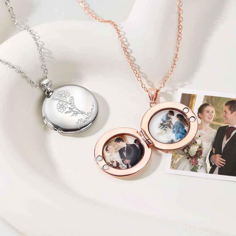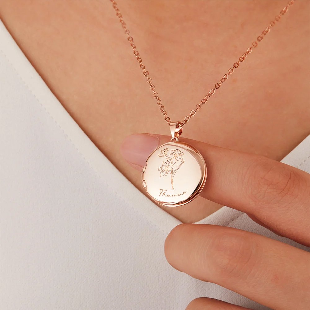 Dette personlige medaljongkjedet med fødselsblomst og bilde lar deg bære kjære minner tett ved hjertet. Medaljongen kan åpnes og gir plass til et spesielt foto, noe som gjør det til et vakkert minne.