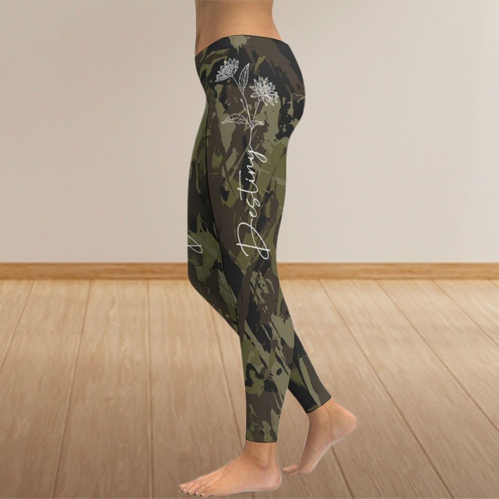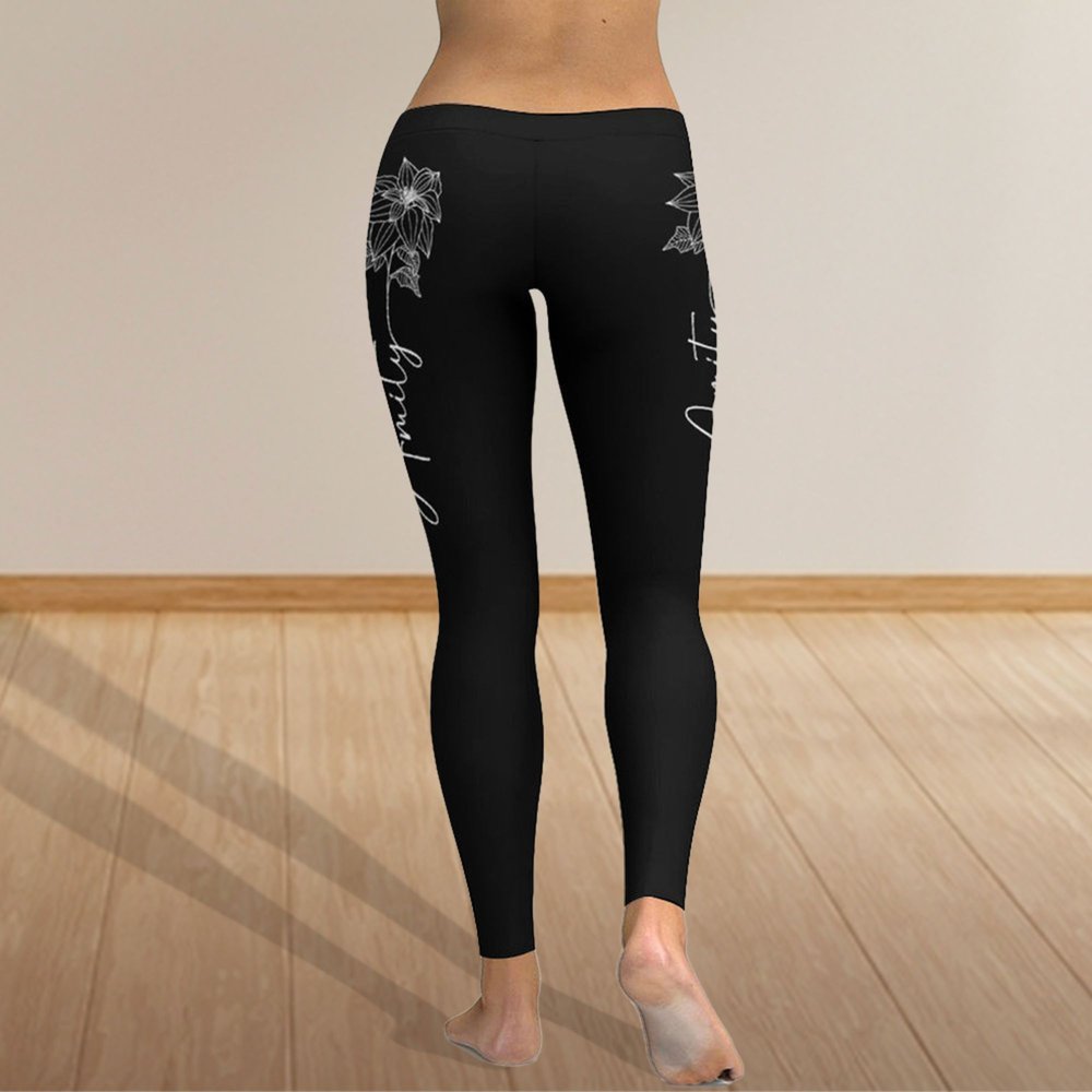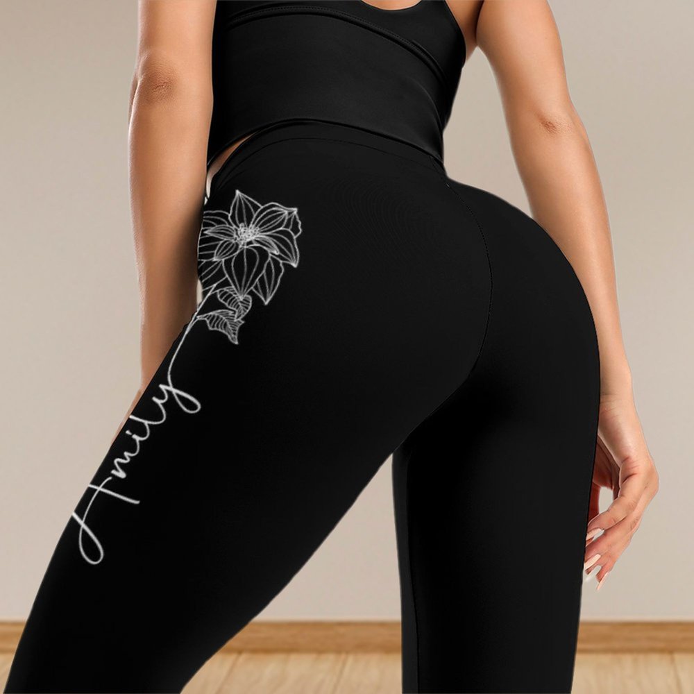 Features a birth flower pattern personalized with your name, creating a unique and stylish activewear piece. The artistic floral design is thoughtfully placed to enhance the leggings' aesthetic appeal. The personalized name adds a distinctive touch to standard athletic wear. Perfect for those who want to express individuality during workouts.