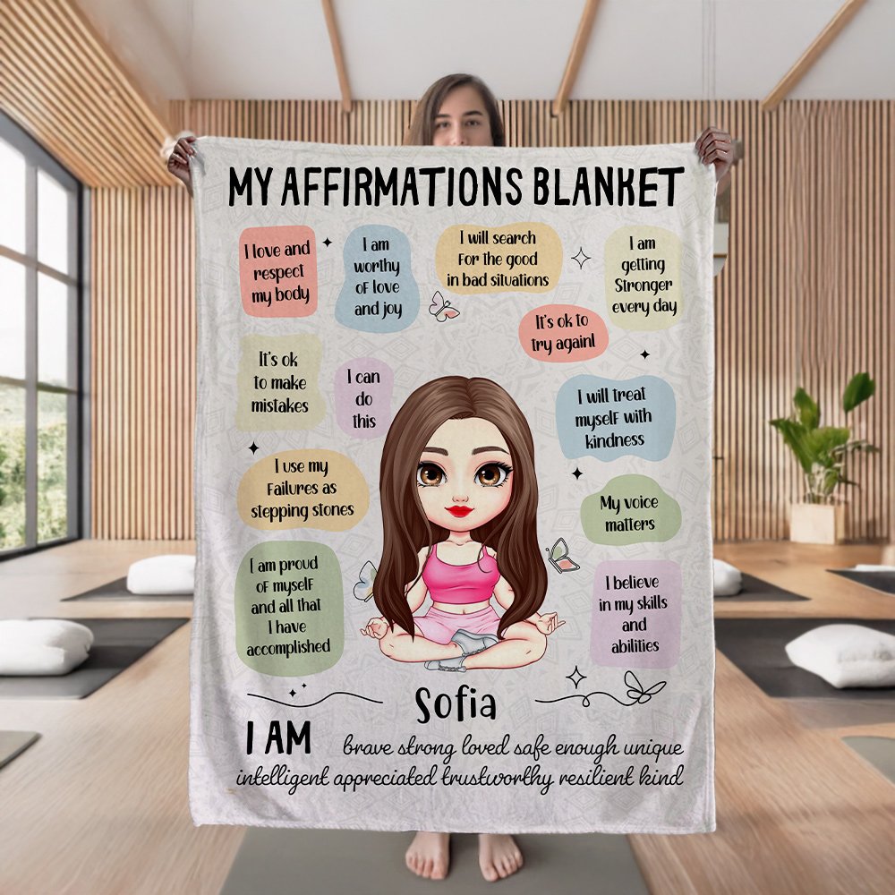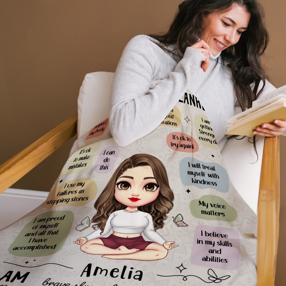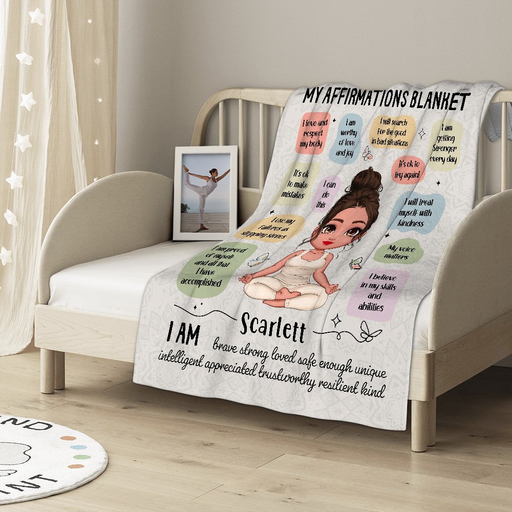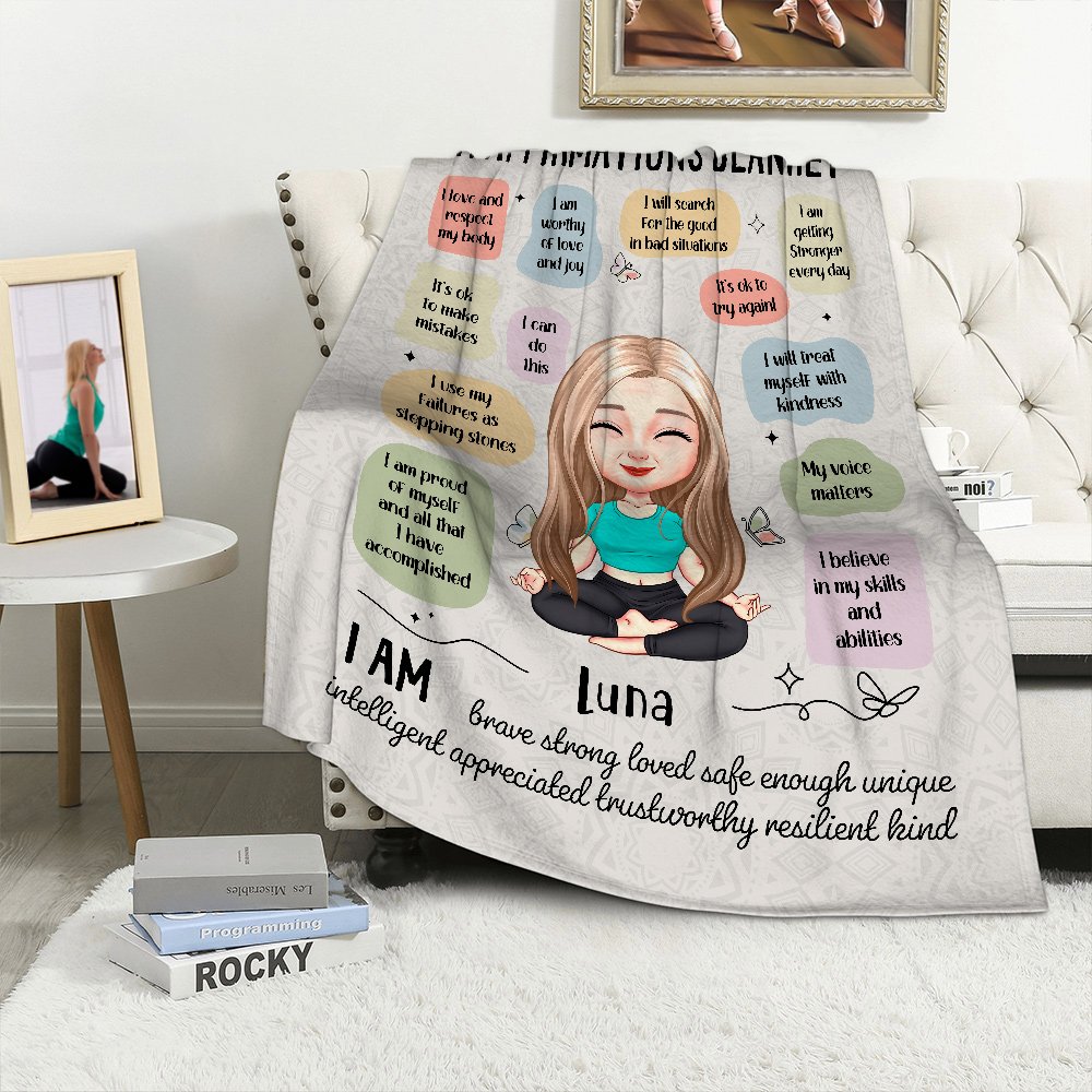 Personalized Butterfly Cartoon Yoga Character Affirmations Soft Throw Blanket with Name Home Decor Birthday Gift for Yoga Lovers Women Girls