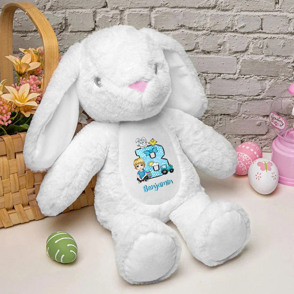 This personalized bunny toy is a great festive decoration for Easter. Place it on a shelf, in a basket, or as a centerpiece to add whimsy and charm to holiday decor.
