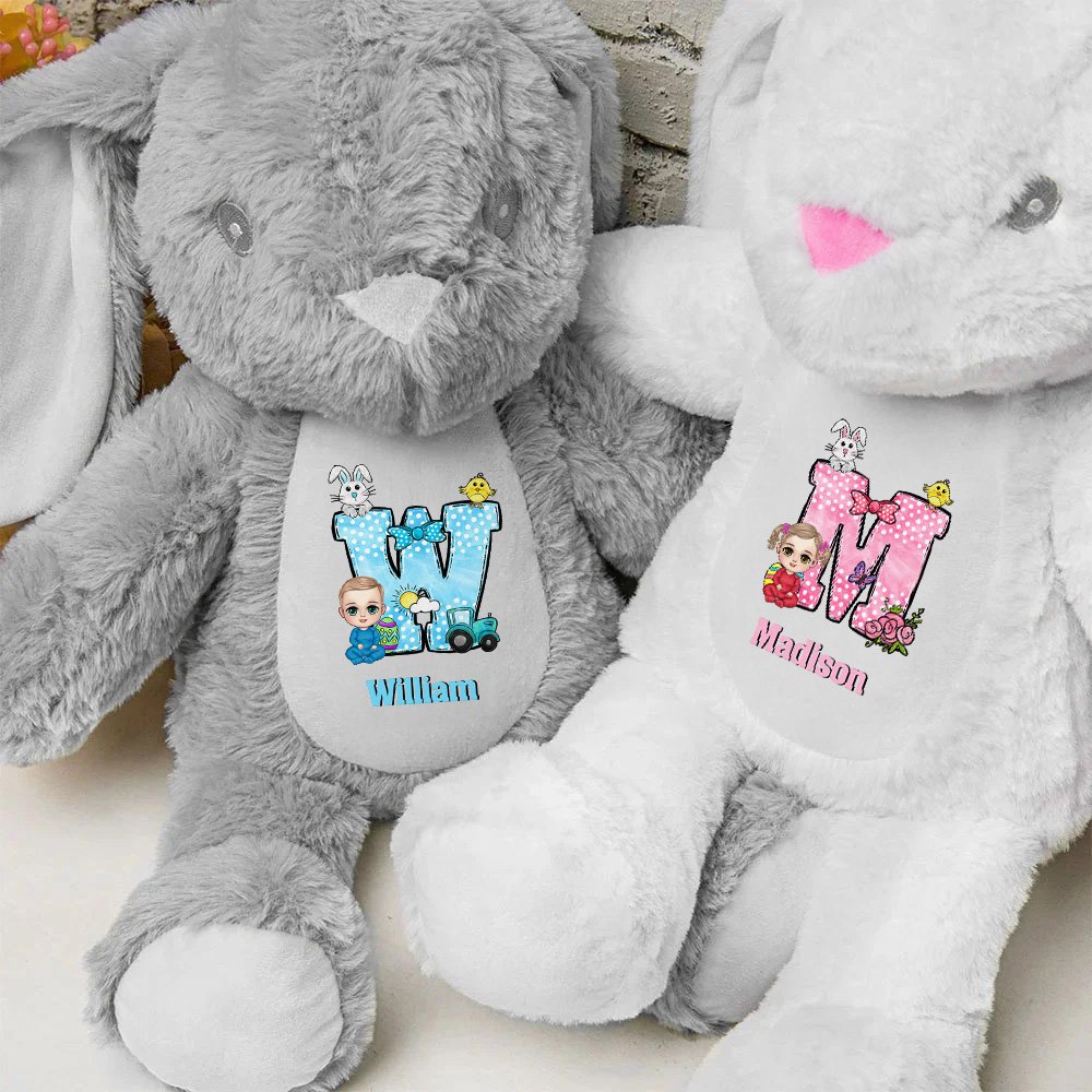 This cute plush bunny toy features an Initial paired with a bow, bunny, bird, and egg, while you can customize your own cartoon on it, making it a unique and thoughtful present.