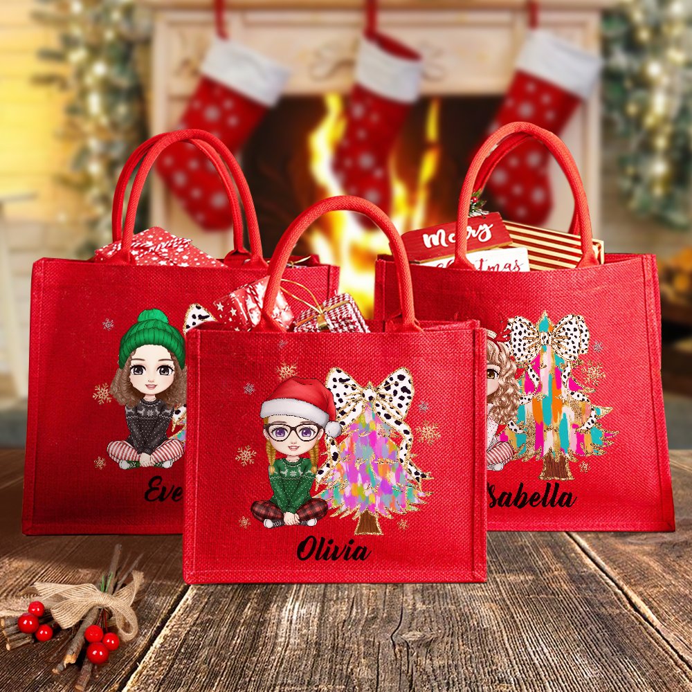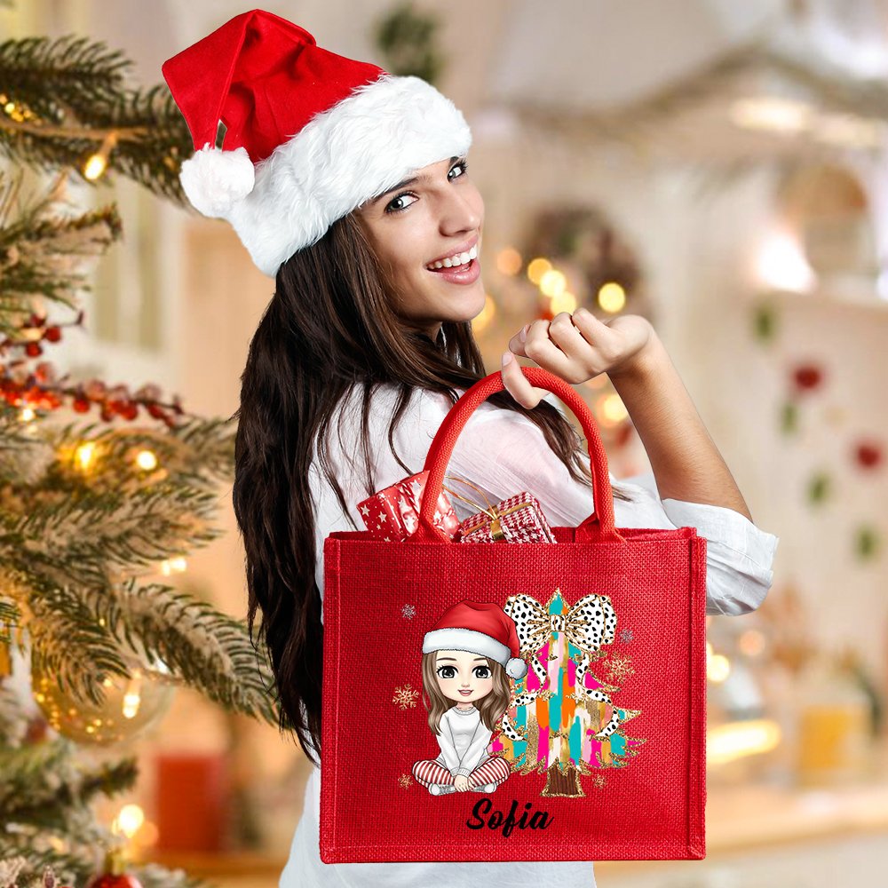 This tote bag is designed for the festive atmosphere. The red jute and cute cartoon characters create an intense Christmas atmosphere. The shiny snowflakes and Christmas tree patterns on the bag add to the joyous feeling of the festival. In addition, names can be added to the tote bag so that each user can have a unique and exclusive style, adding more warmth and intimacy.
