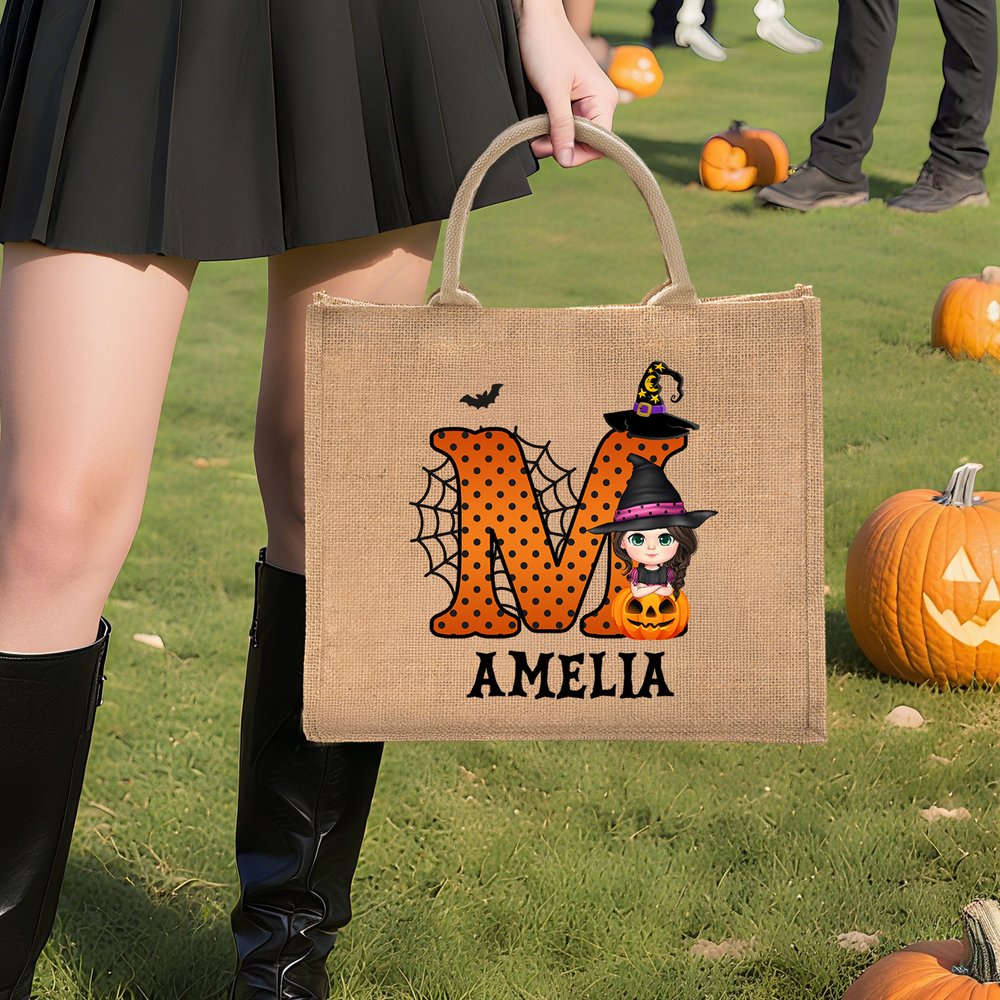 The trick-or-treat bag features personalized Halloween-themed designs such as bat, pumpkin, spider web, witch hat, etc., Which adds a Halloween atmosphere and becomes a part of your Halloween accessory. This tote bag also combines a personalized cartoon character design and the recipient's name, making it a unique and festive Halloween accessory.