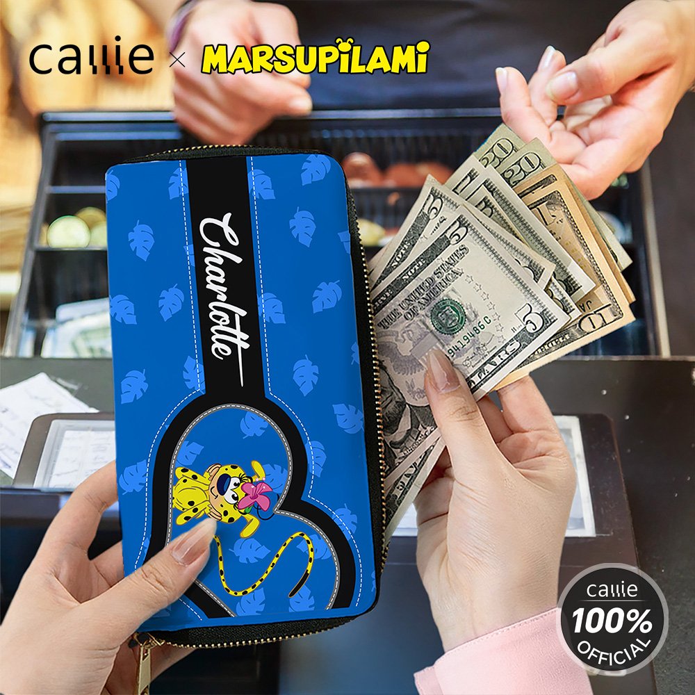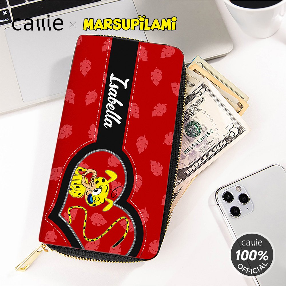 Centered around the adorable long-tailed leopard Marsupilam, this wallet features playful heart elements, giving it an overall charming and whimsical style. Marsupilam is a cartoon character created by Belgian cartoonist André Franquin in 1952. He is a yellow, black-spotted, dog-eared, leopard-like creature with a very long tail, making him quite funny. You can also customize the wallet with your name, making it instantly unique.