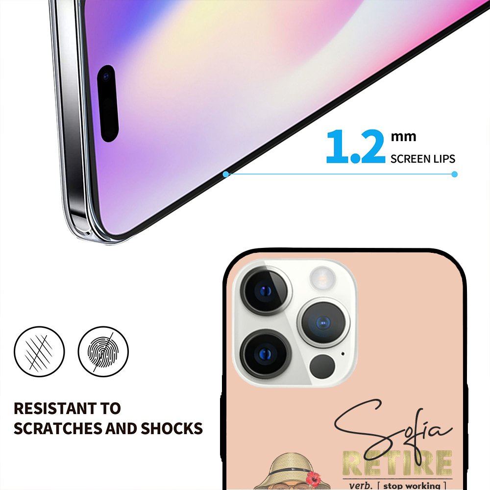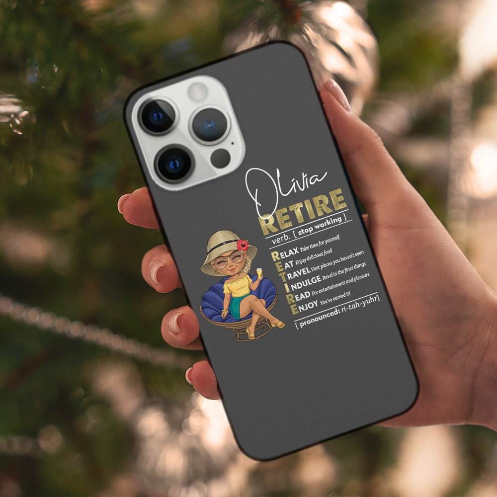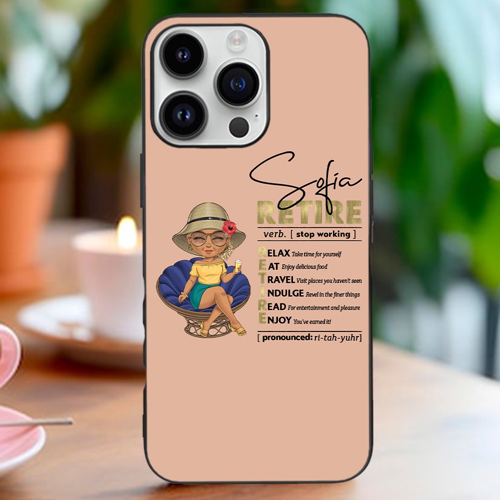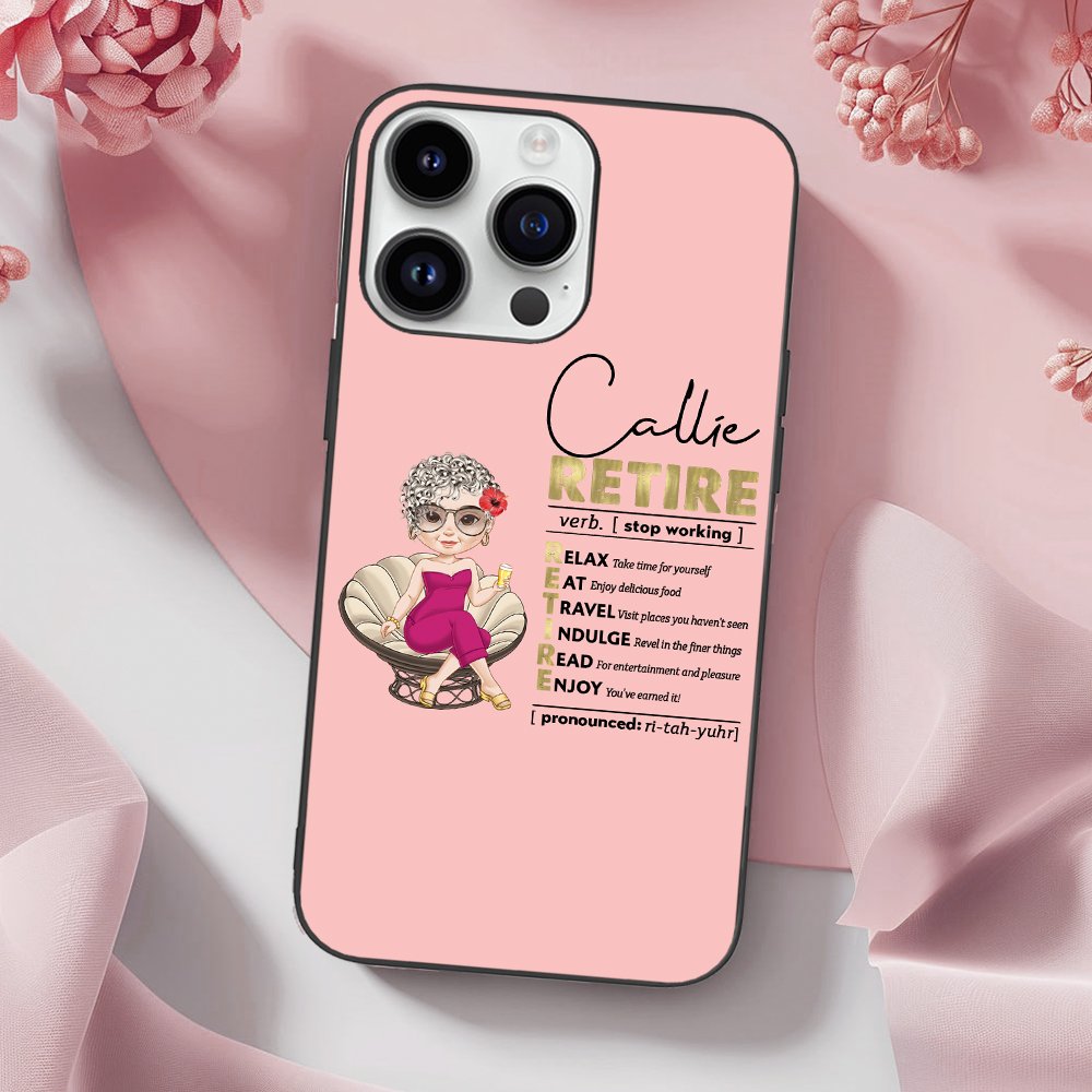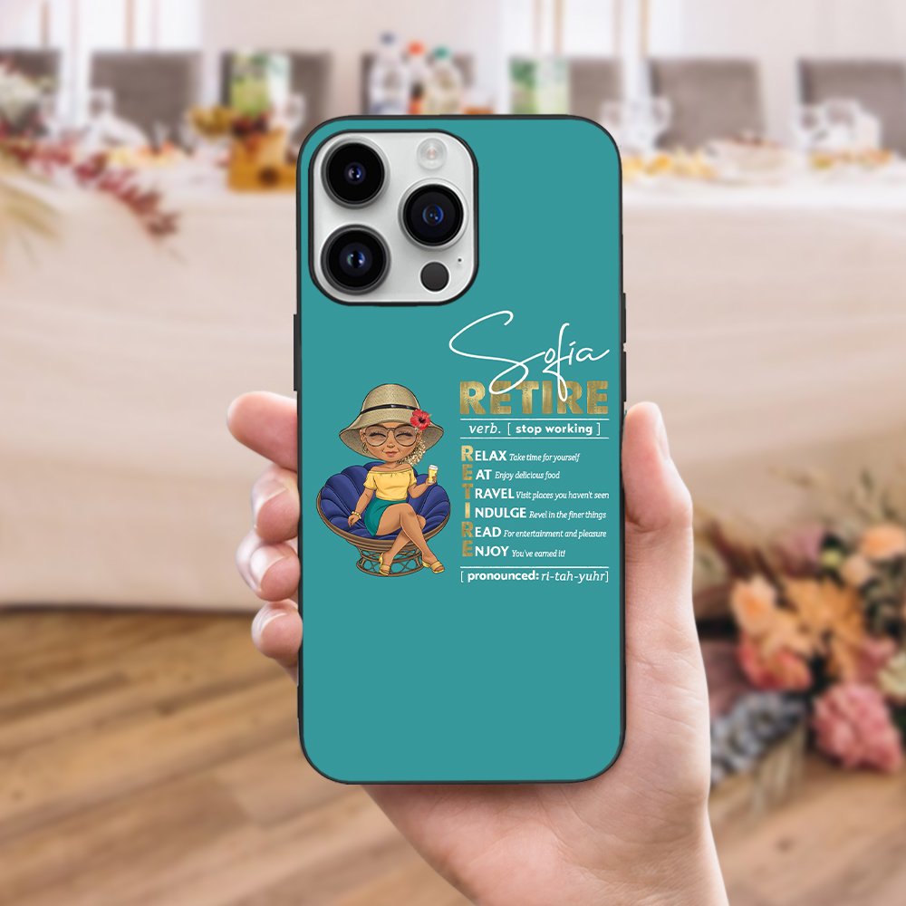 Dette mobildekselet er trykt med et tegneseriebilde av en pensjonert kvinne, som er både lekent og moteriktig, og er kombinert med definisjonsteksten "RETIRE", som kombinerer pensjonstemaet med personlig stil på en perfekt måte. Navnet som kan tilpasses, gjør mobildekselet unikt og fremhever din unike smak og komforten ved pensjonisttilværelsen.