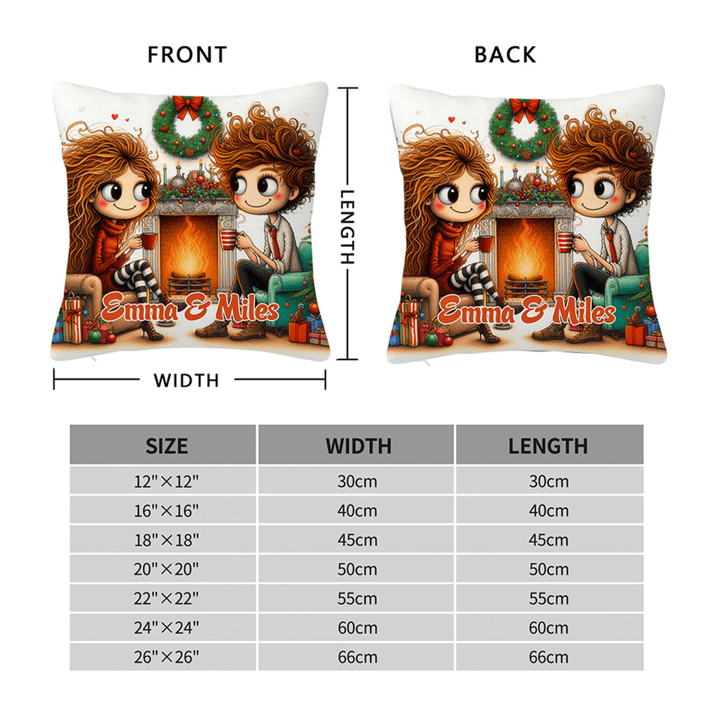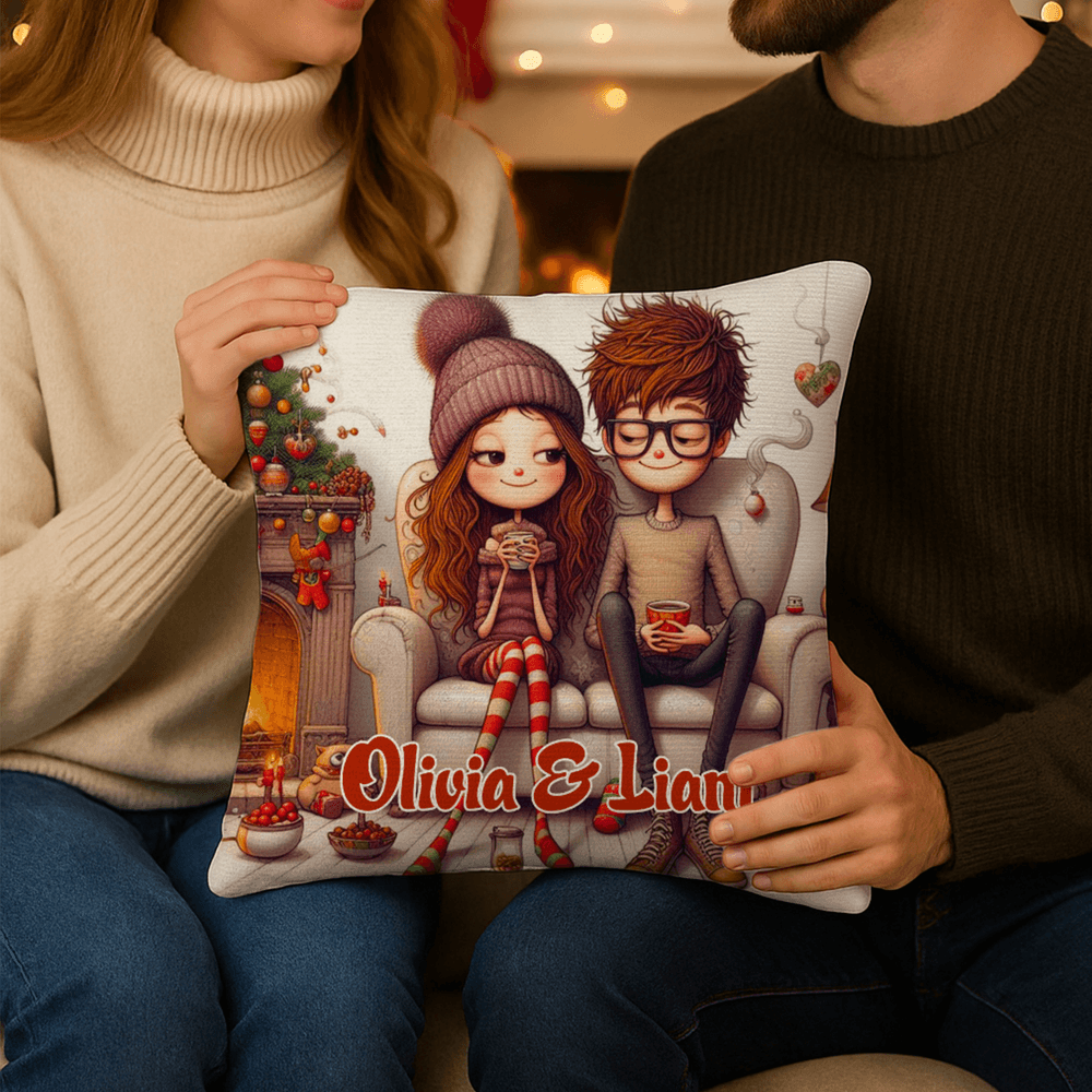 The pillowcase features lively cartoon characters that depict the warm moments shared between you and your partner. Accompanied by the coziness of a fireplace and sofa, festive decorations, and beautifully wrapped gifts, these elements serve as a reflection of your love, constantly reminding each other of what is precious and beautiful. We offer customizable names in a variety of colors, ensuring that every cuddle is filled with sweet memories.