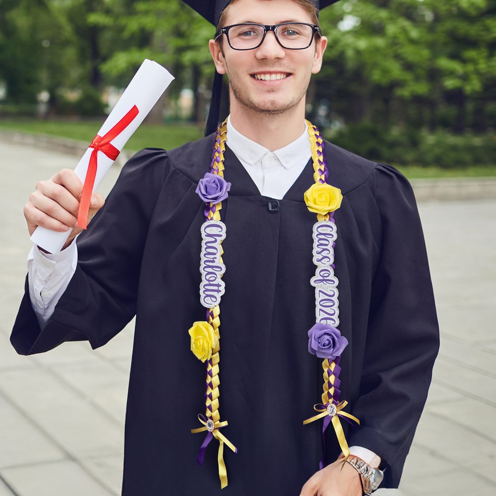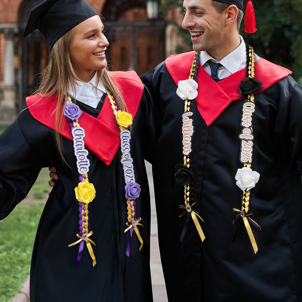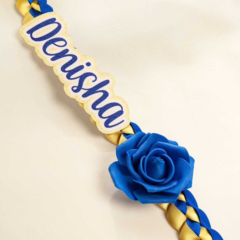 This graduation ribbon lei is intricately braided from two-color ribbons, creating a vibrant and eye-catching design. Elegant roses adorn both sides of the ribbon, while a rhinestone-studded bow at the bottom adds a touch of glamour and elegance. You can customize each side of the ribbon with a unique text on a glitter background, making it a highly recognizable personal statement at your graduation ceremony.