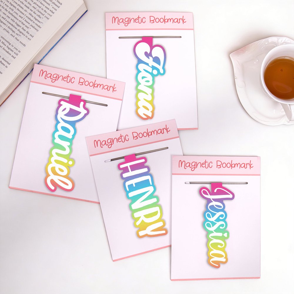 Featuring an exquisite gradient color palette, this bookmark clip suspends names within a spectrum of hues, as if capturing the essence of a rainbow between pages. Multiple font styles harmonize with the gradient design, enhancing its artistic appeal. The overall design is simple and fashionable. Whether placed in classic literature or modern magazines, it can become a striking sight.