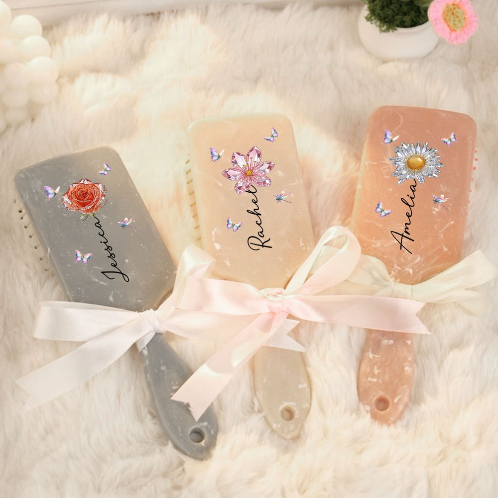 Denne padlebørsten har et delikat bånd og et fantastisk design av en fødselsblomst med krystalleffekt, glitrende aksenter og delikate sommerfugldetaljer, som symboliserer renhet, evighet og dyrebar kjærlighet. Den kan personaliseres fullt ut - legg til et eget navn for å skape et unikt smykke som fanger opp unike velsignelser og hengivenhet. Den drømmende, iriserende finishen fremhever blomstermotivet og gjør den både til et funksjonelt verktøy og et meningsfylt minne.