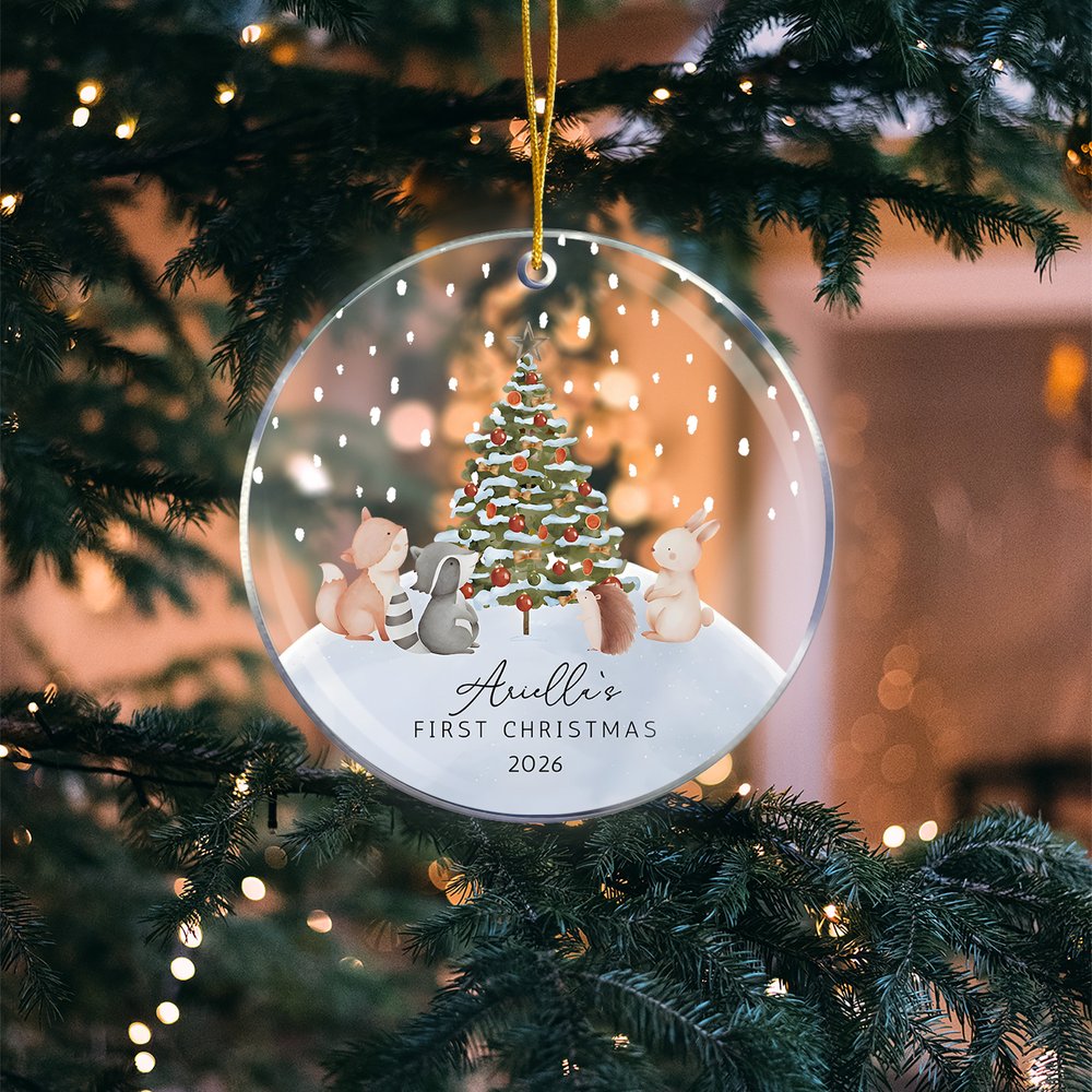 This ornament features an adorable woodland winter scene with cute animals and a Christmas tree. You can personalize it with your baby's name and the year, making it a perfect keepsake to commemorate your baby's first Christmas and the special bond between parents and child.