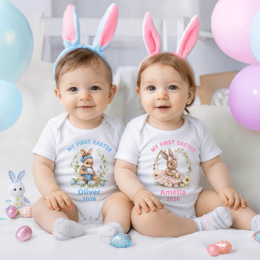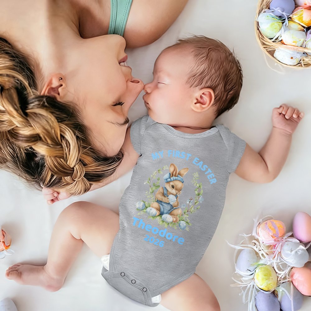 Med en søt påskehare som det sentrale motivet, pyntet med blomster- og eggdekorasjoner sammen med en tekst med festlig tema. Finnes i gutte- og jentestiler med fire fargealternativer, samt mulighet for å tilpasse babyens navn og årstall. Perfekt til å forevige høytidsminner og skape et unikt minne om barnets vekst.