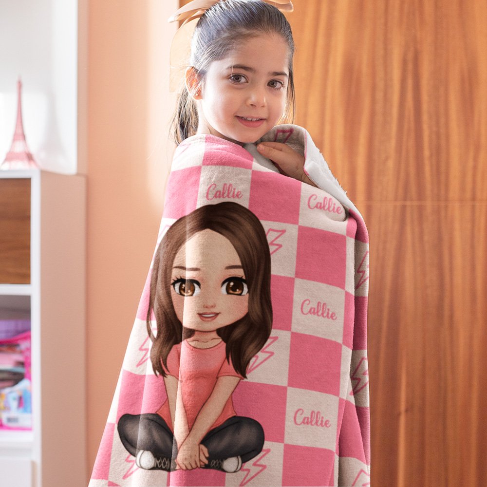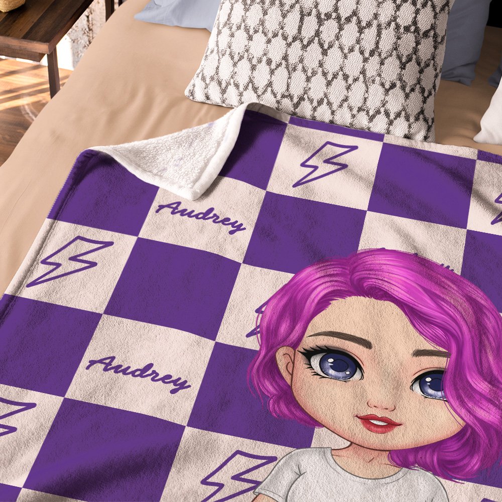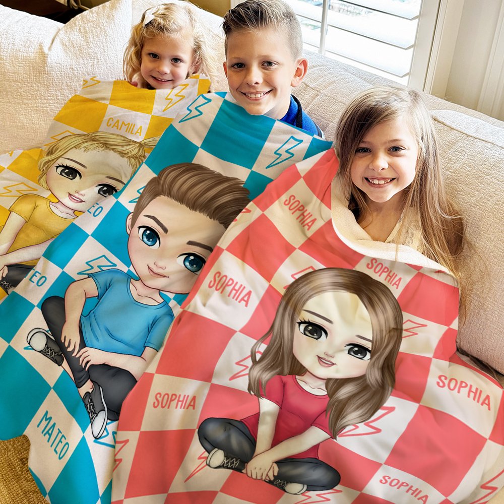 This throw blanket is available in multiple colors. It features adorable cartoon characters set against a playful checkered and lightning pattern, making it a fantastic addition to any child's or adult's room. Personalize it by adding multiple names, transforming an ordinary blanket into a personal keepsake.