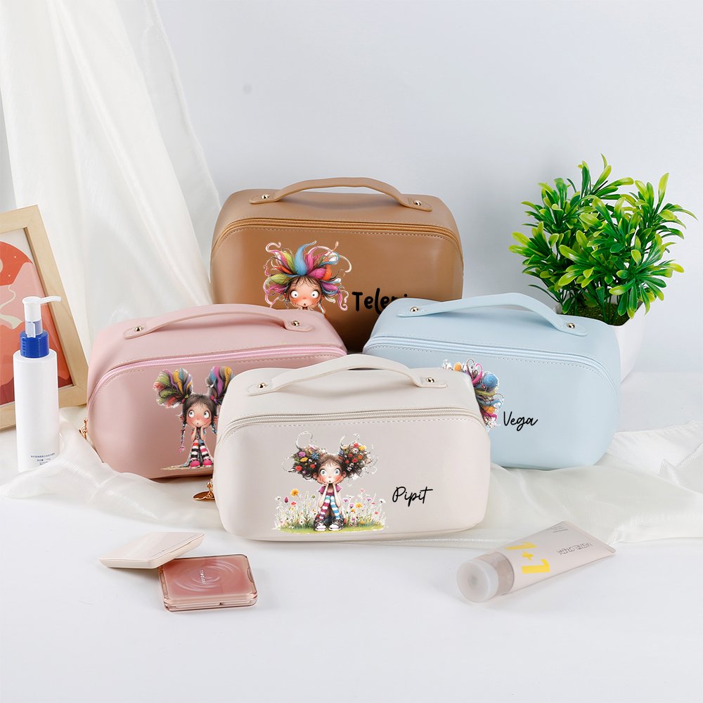 This makeup bag has playful and quirky cartoon graphics and adds fun to your travel essentials. Its whimsical design will delight anyone who receives it as a gift, making it a standout accessory. Customize it with a name to make it a unique accessory, perfect for anyone who loves to express their personality.
