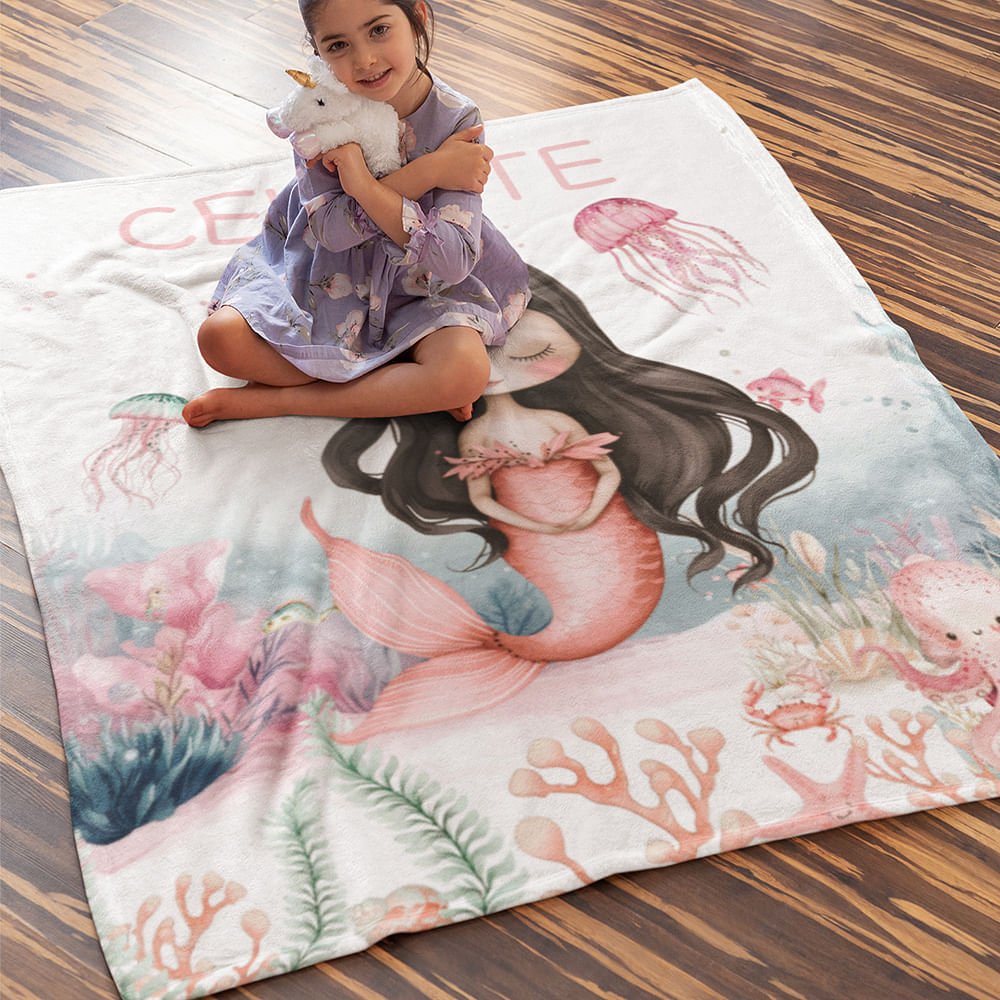 This baby blanket features a charming mermaid design, making it a dreamy and adorable choice for little girls. The beautiful marine creatures such as corals, jellyfish, octopuses, etc. add fairy tale charm and create a comfortable and warm atmosphere for your baby girl.