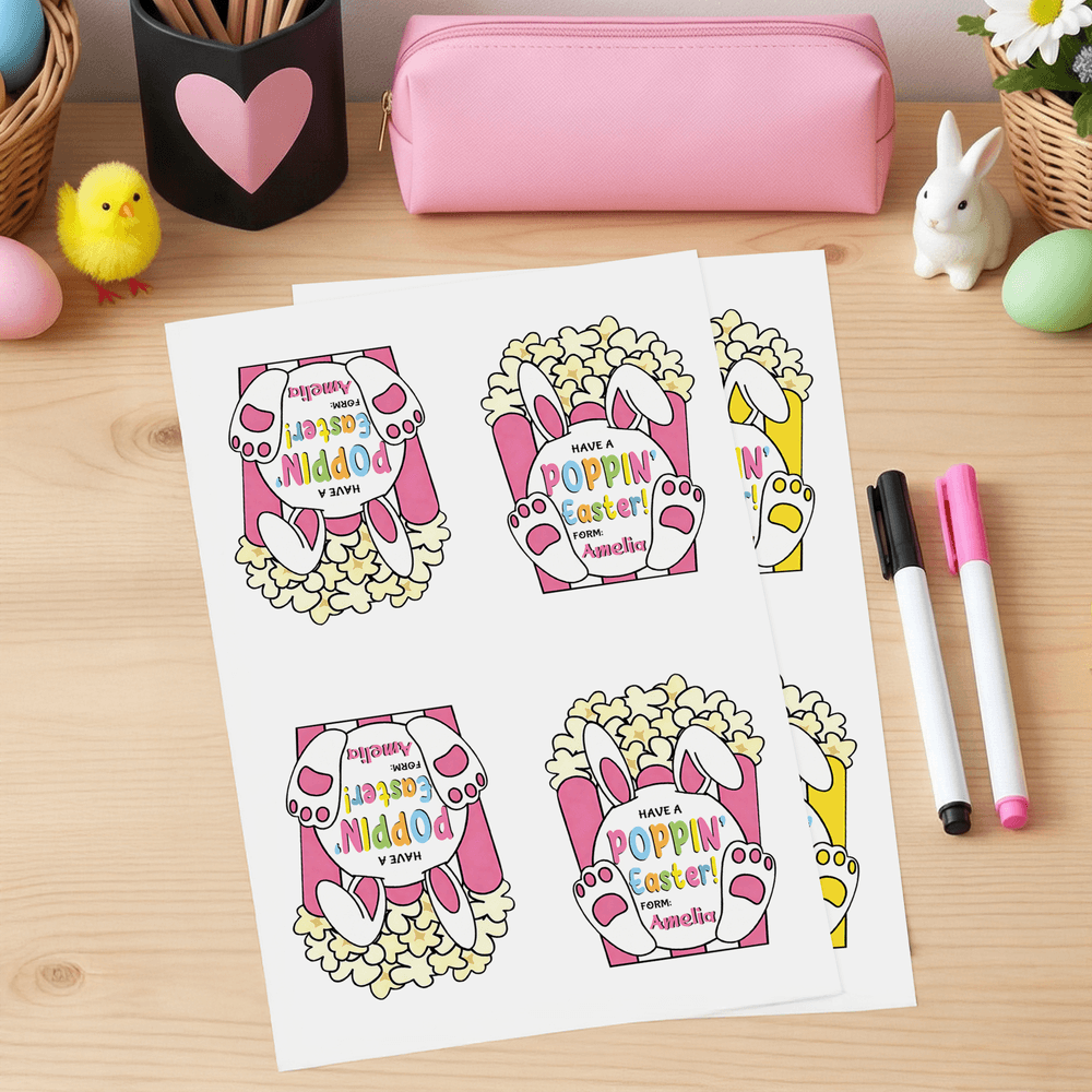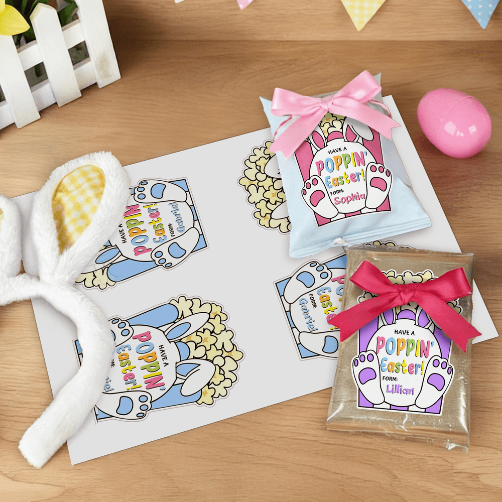 These delightful stickers feature charming bunny motifs accentuated with playful elements. They can be personalized with children's names, adding a whimsical touch that embodies the spirit of Easter and captures the joy of childhood.