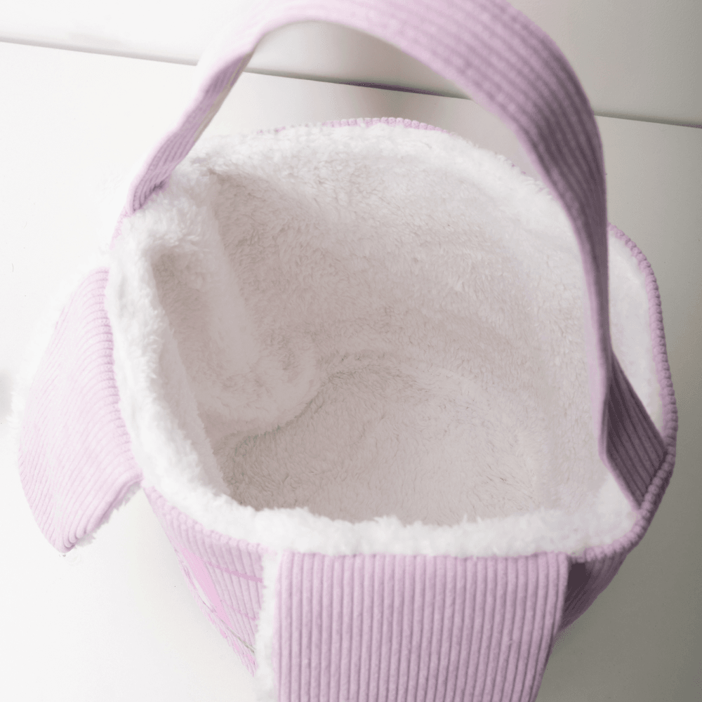 Den er laget av koselig kordfløyelstoff som føles mykt å ta på og holder formen godt. Kraftige sømmer og et komfortabelt håndtak gjør den slitesterk nok til å tåle spennende eggjakter og gjentatt bruk. Det høykvalitets trykket har en imitert 3D-effekt som gir dybde og detaljer, slik at designet forblir levende og kurven søt og robust år etter år.