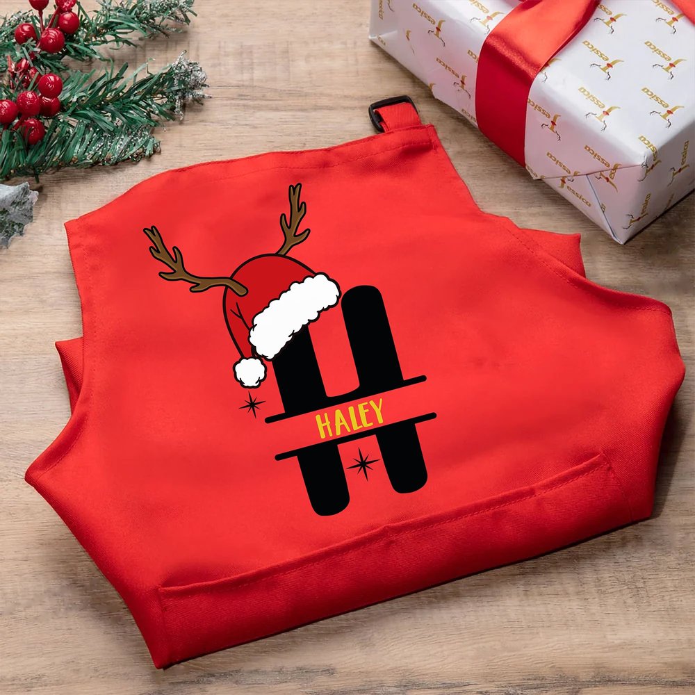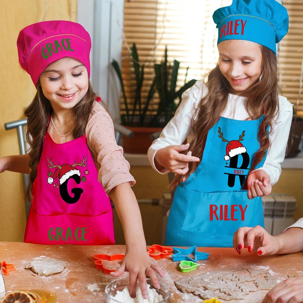 Personalized Cute Reindeer Santa Hat Initial Adjustable Kid Apron Chef Hat Set with Name Children's Day Christmas Gift for Boys Girls