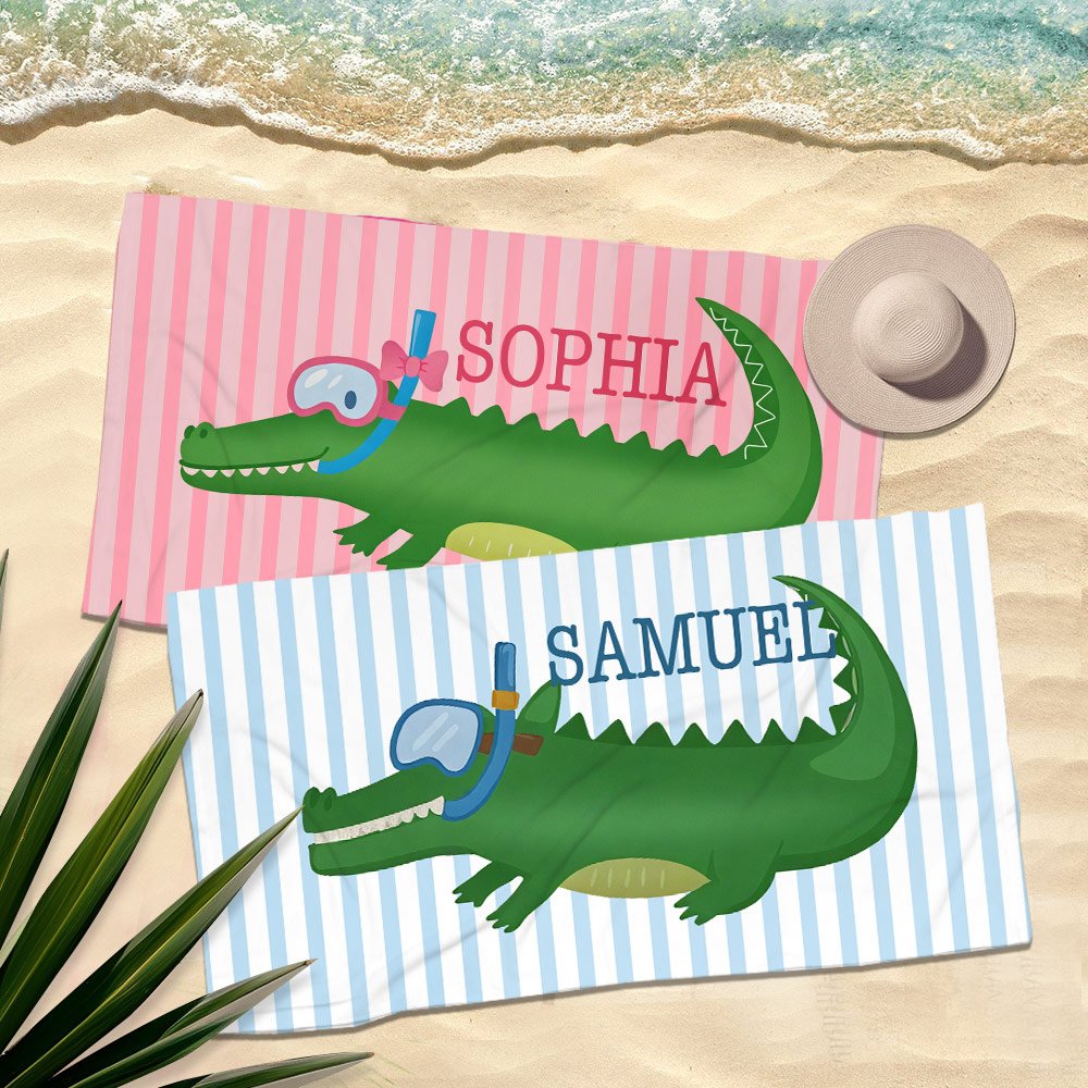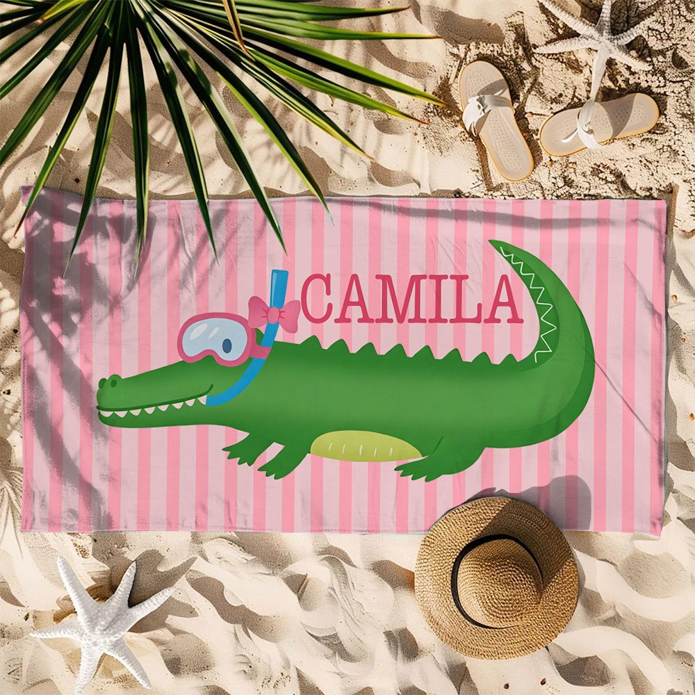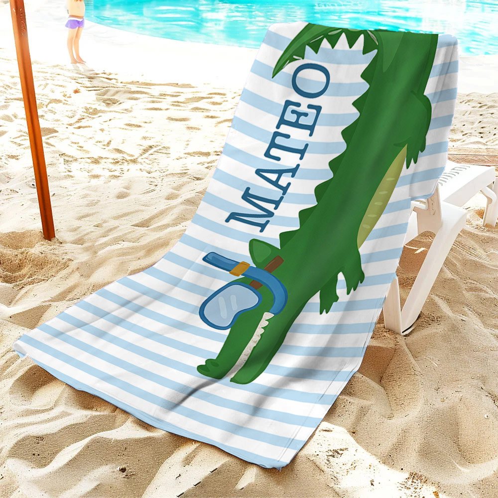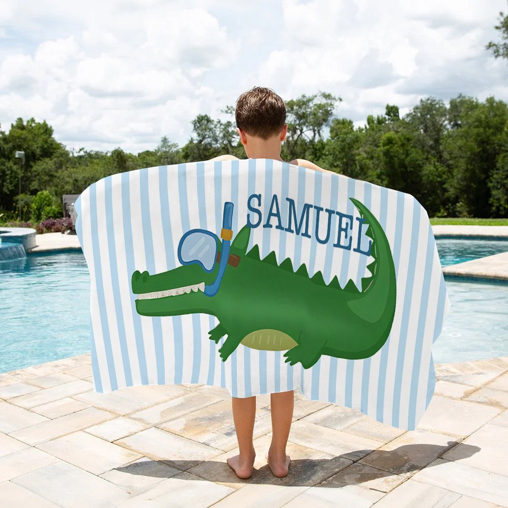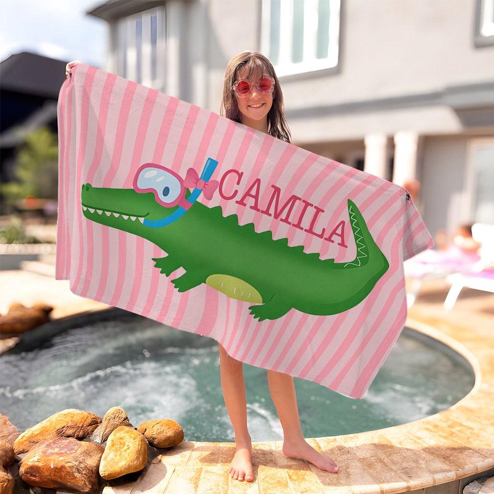 The design of this beach towel is inspired by the cute alligator pattern that children love the most, with classic stripes, as if turning the entire beach into a playground. The playful expression of the alligator, the vivid decoration of diving tools, and the personalized name customization will surely make children love it and make it an indispensable part of their beach equipment.