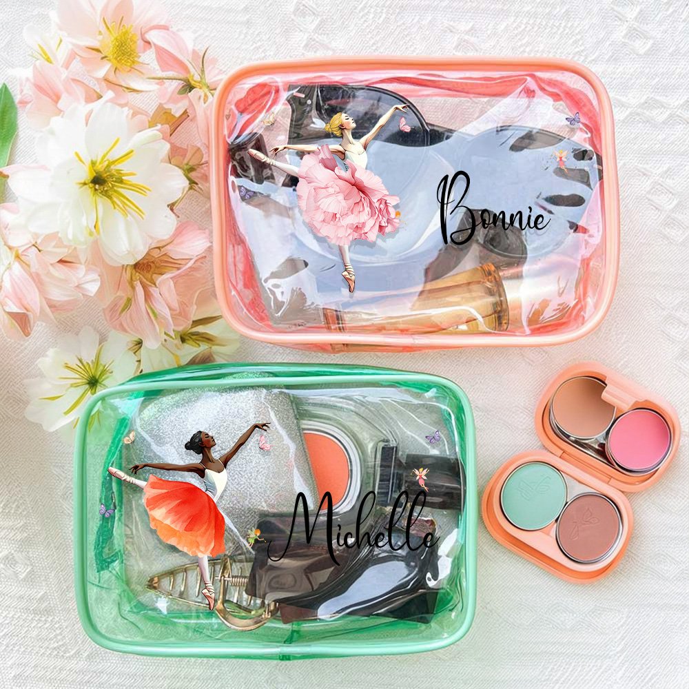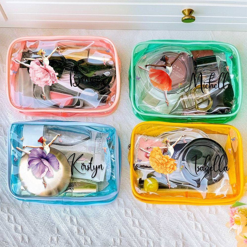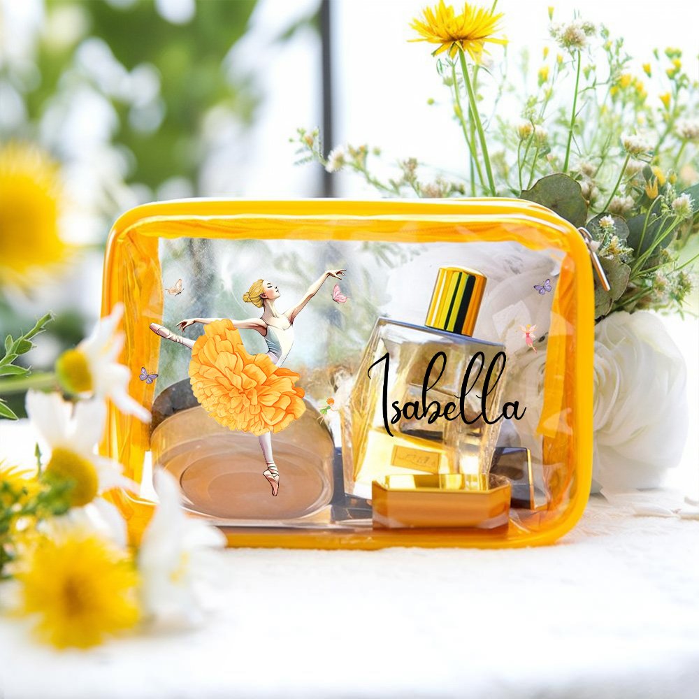 This clear makeup bag features exquisite cartoon dancer figures. Each dancer is depicted in a graceful dance pose, showcasing her flexibility and creating a healthy and vibrant atmosphere. The skirt is designed in the shape of a birthday flower, allowing you to customize the style based on the specific birthday. Additionally, you can add a name to the bag, giving it a unique and distinctive flair.