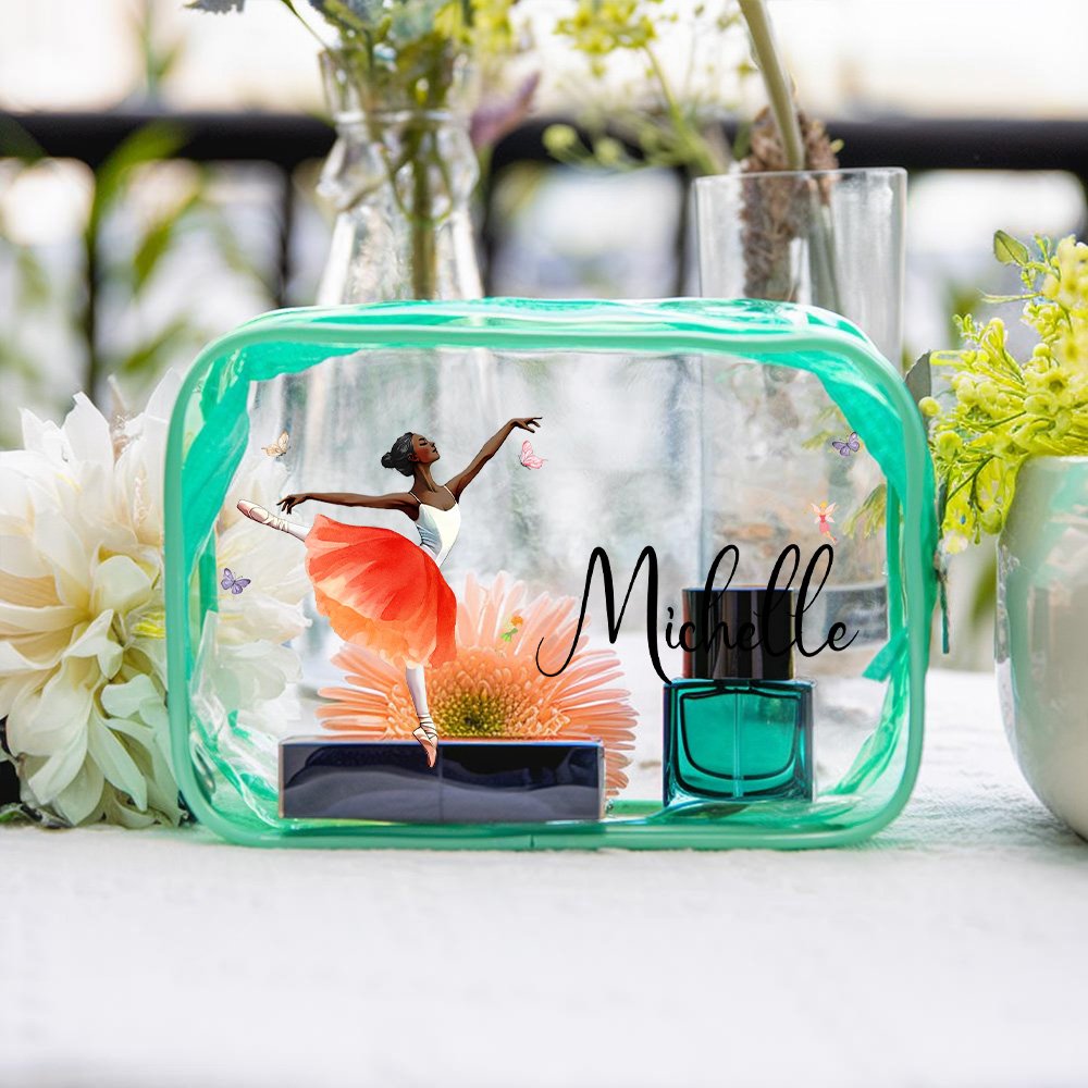 Personalized Dancer Birth Flower Design Waterproof Clear Makeup Bag with Name Travel Essentials Birthday Gift for Women Dance Lovers