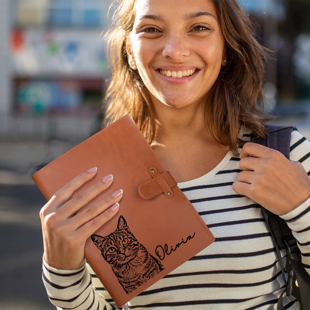 Dette personlige bokomslaget i skinn er en gjennomtenkt gave som kombinerer kunst og funksjonalitet, perfekt for den som elsker skisser eller kjæledyr, og for kontorfolket.