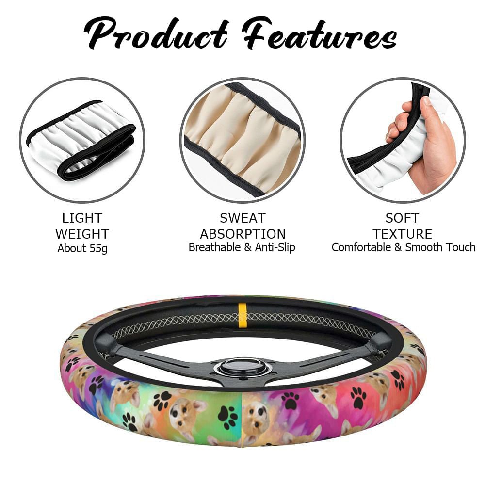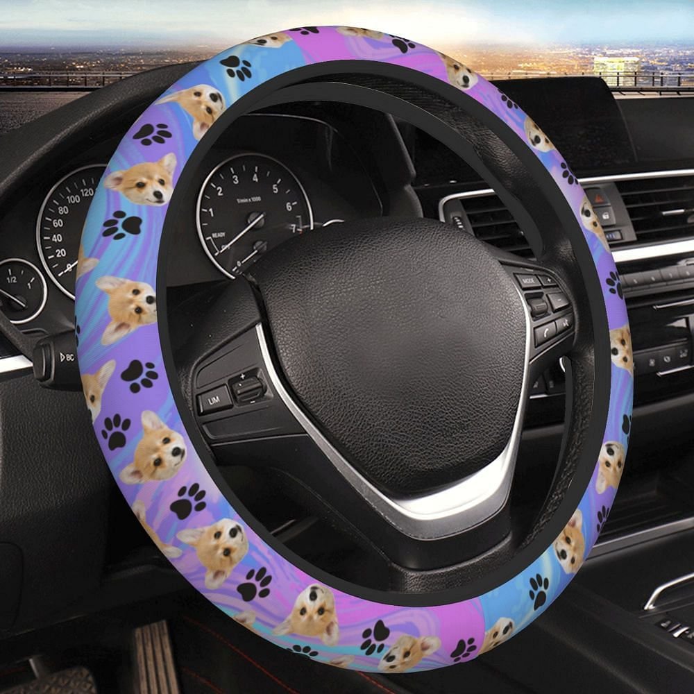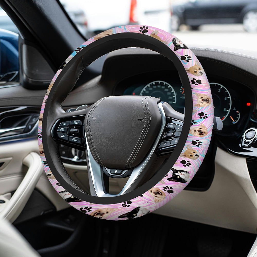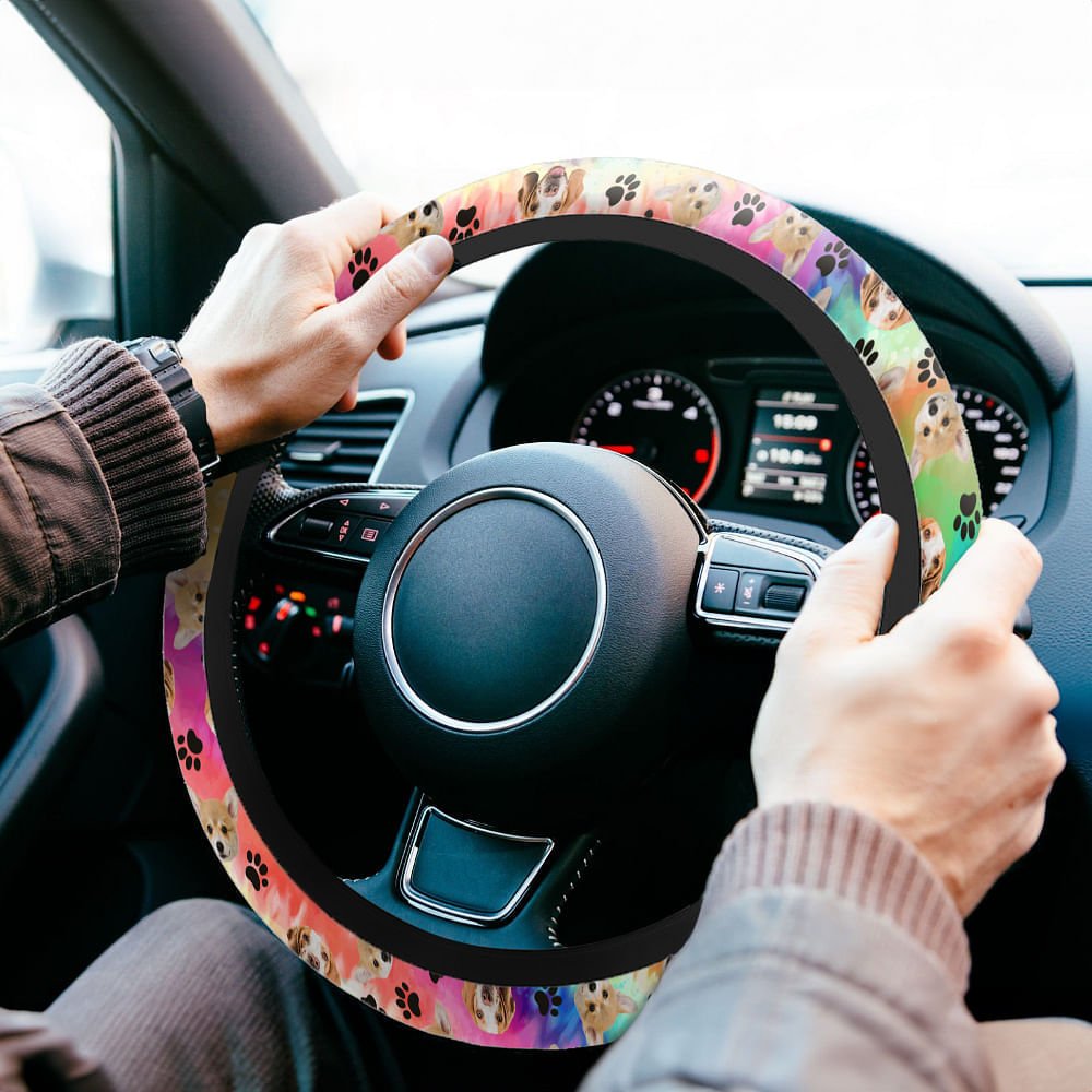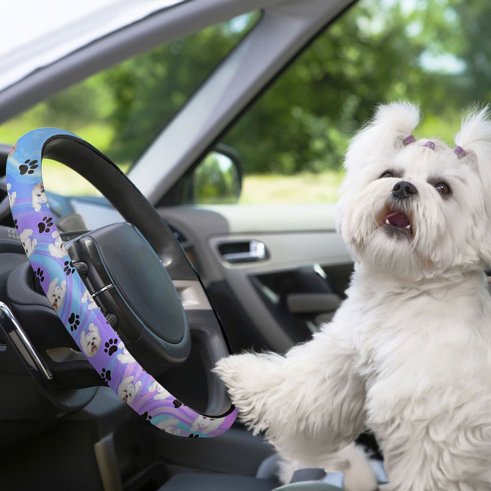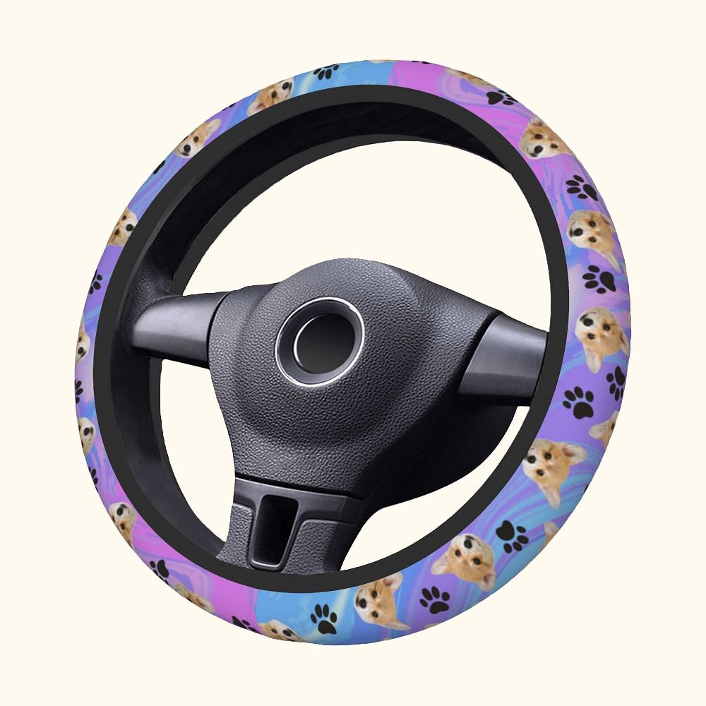 Dette rattdekselet har en livlig batikkbakgrunn og kan tilpasses med portrettet av kjæledyret ditt, noe som gir bilen din et personlig preg. Det er utsmykket med lekne poteavtrykk og benelementer, og hyller din pelskledde venn med stil.