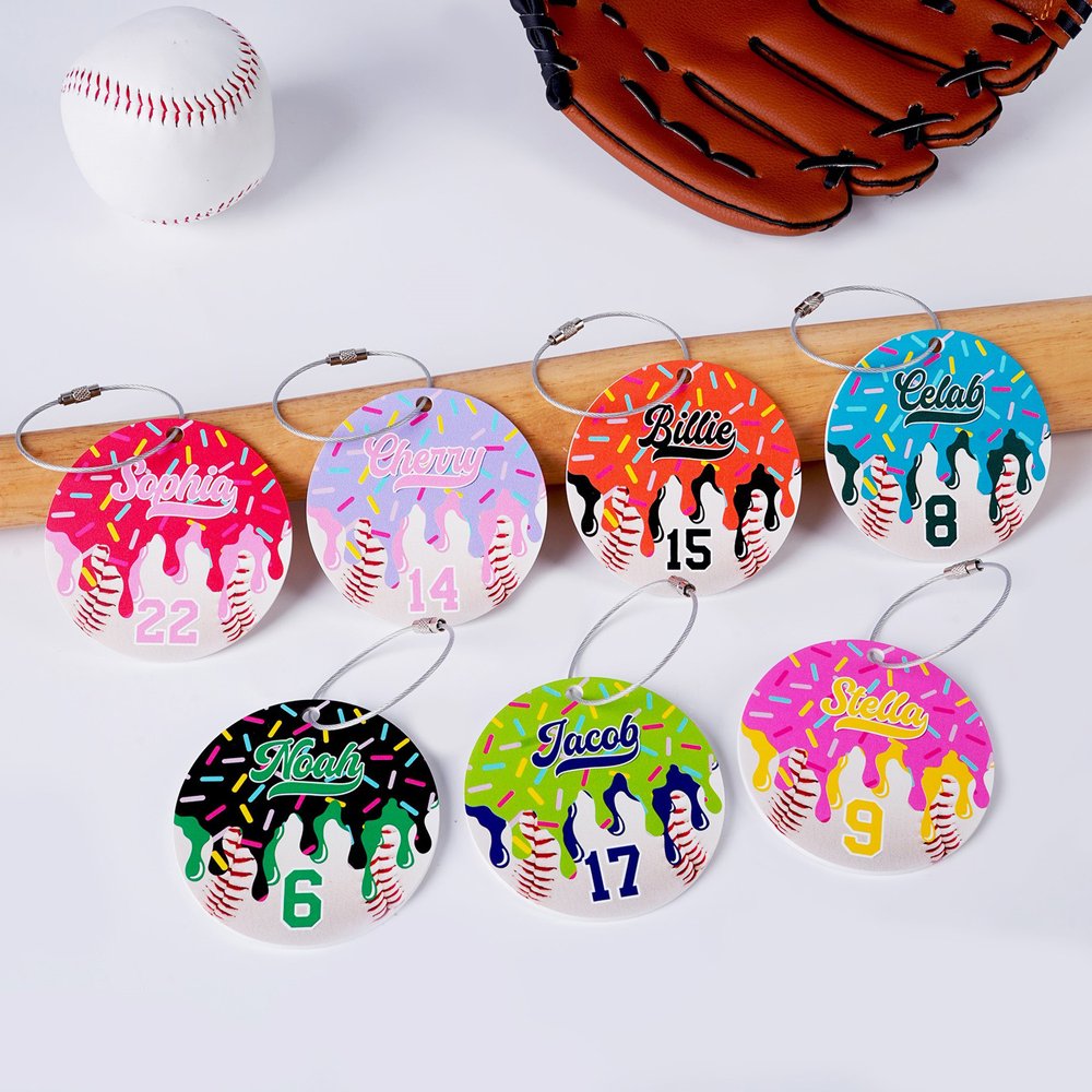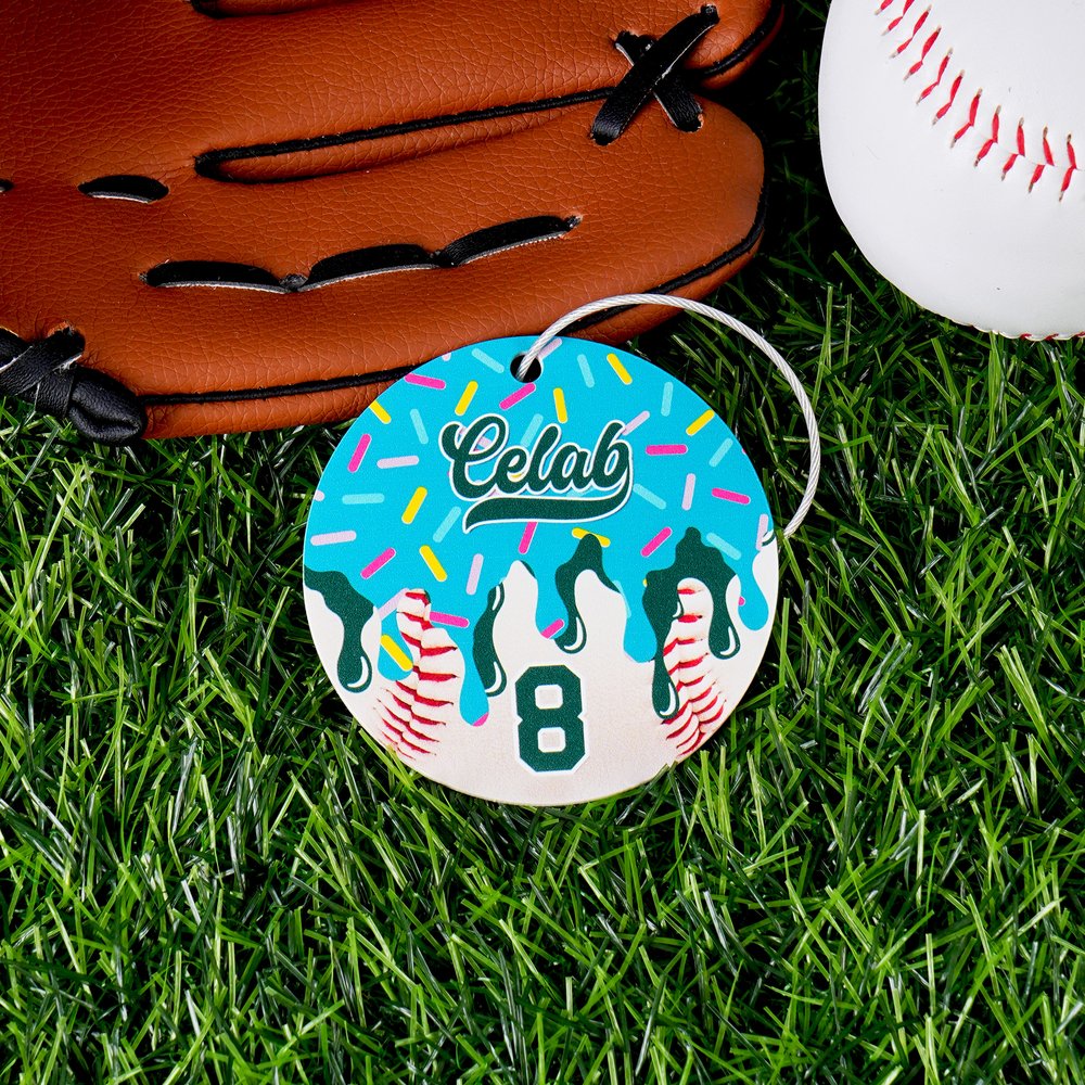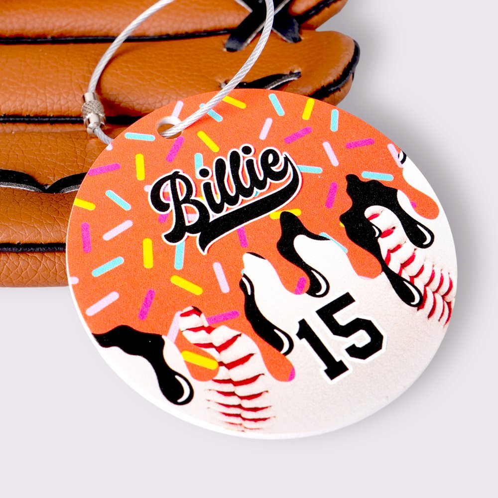 Featuring a creative fusion of a baseball and a melting donut drop, the top half features a sweet donut design embellished with colorful candy, while the bottom half features classic baseball elements, with a "chocolate sauce" glaze gracing the center for a seamless transition. This sweet and cool aesthetic creates a unique visual effect. Customizable with your name, number, and color, the tag becomes a unique sportswear symbol, easily distinguishable from ordinary equipment tags.