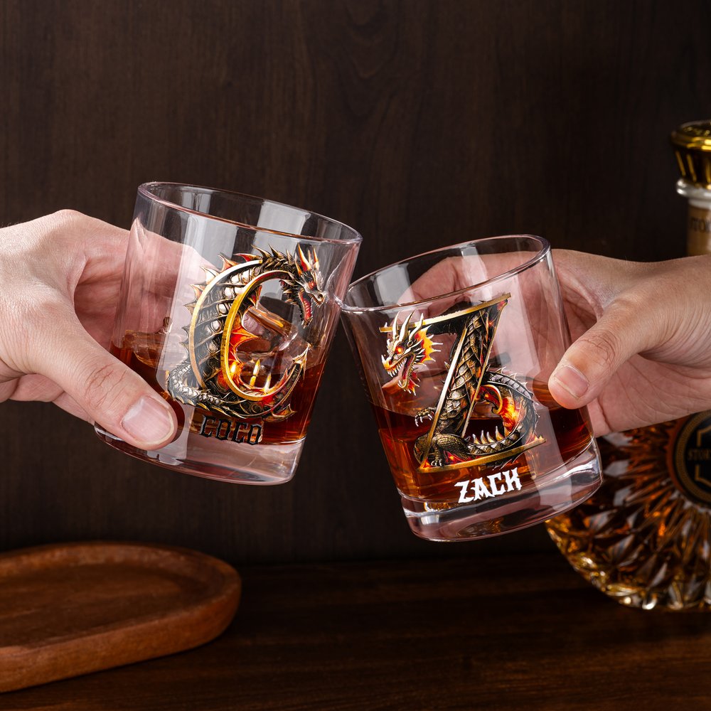 Elevate your whiskey tasting experience with our vintage whiskey glass. Combining the symbolic dragon, representing mystery, power, and nobility, with a personalized letter creates a magical effect imbued with Eastern cultural charm. Customizable with a name, it incorporates personal touches and showcases the wearer's unique style.