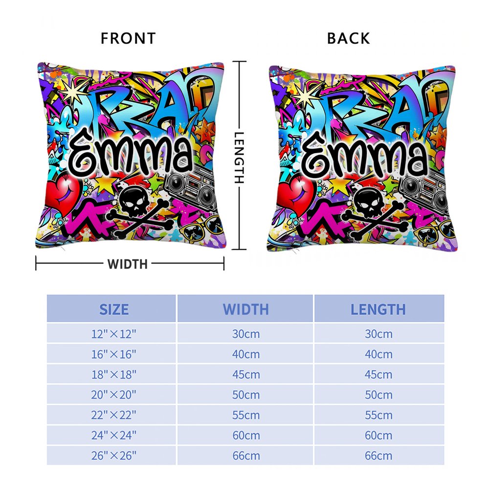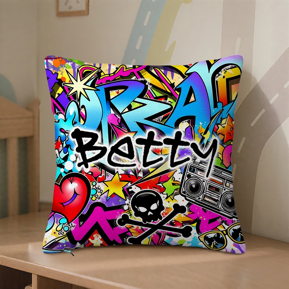 Our throw pillow perfectly embodies the essence of free-spirited street graffiti art. The design features bold, contrasting colors and abstract, extreme elements, resembling an artist's impromptu summer graffiti, exuding boundless energy and dynamism. You can also choose to customize it with a personalized name, adding a unique touch to this vibrant graffiti design.