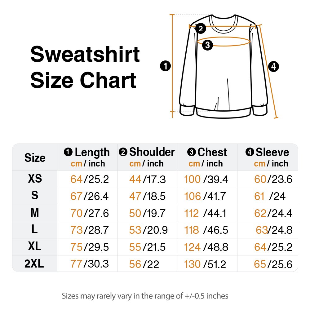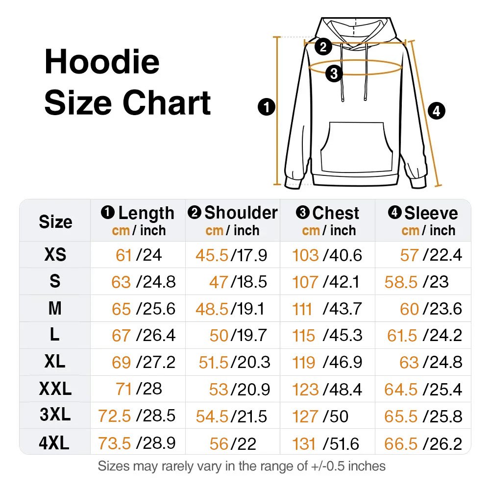 | Measurement: | T-shirt - XS, S, M, L, XL, XXL, 3XL, 4XL Sweatshirt - XS, S, M, L, XL, 2XL Hoodie - XS, S, M, L, XL, XXL, 3XL, 4XL |