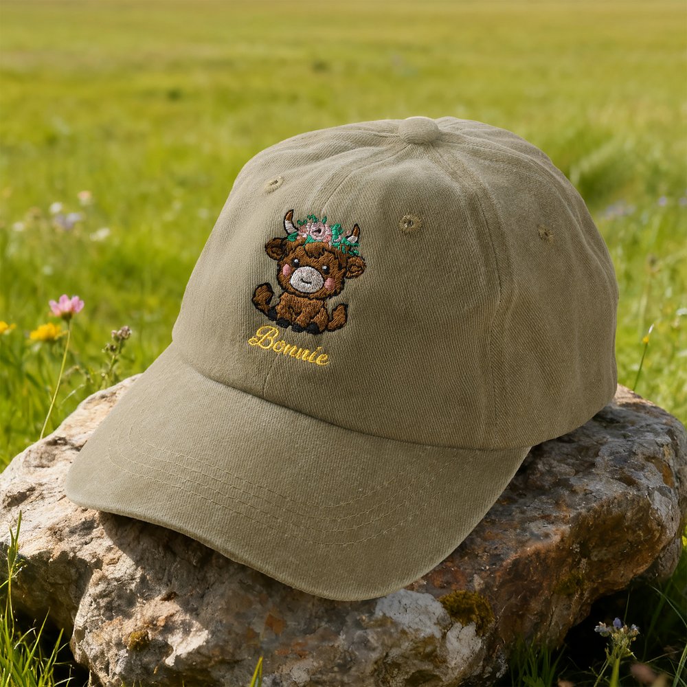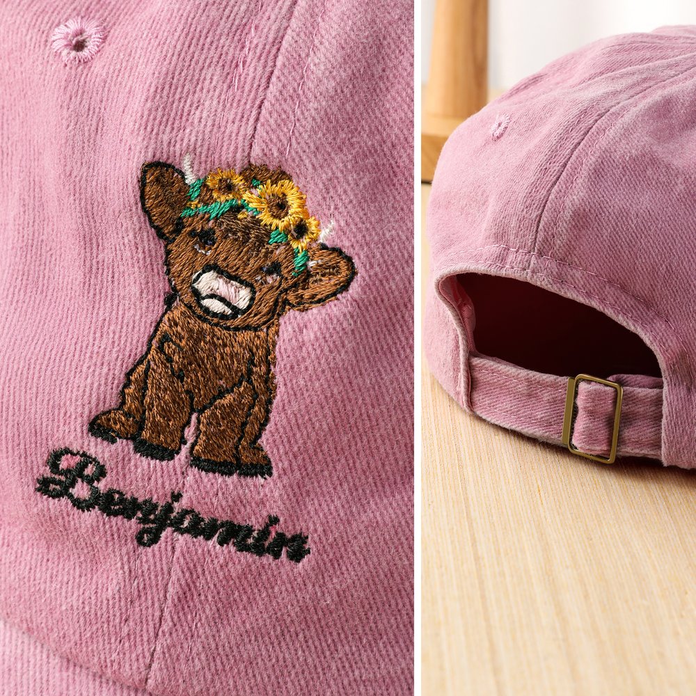 With its distressed retro and charming Highland cow embroidery, this baseball cap brings rustic countryside appeal to everyday style. Choose from 8 unique embroidered designs and personalize it with a child’s name for a cap that’s as unique as they are.