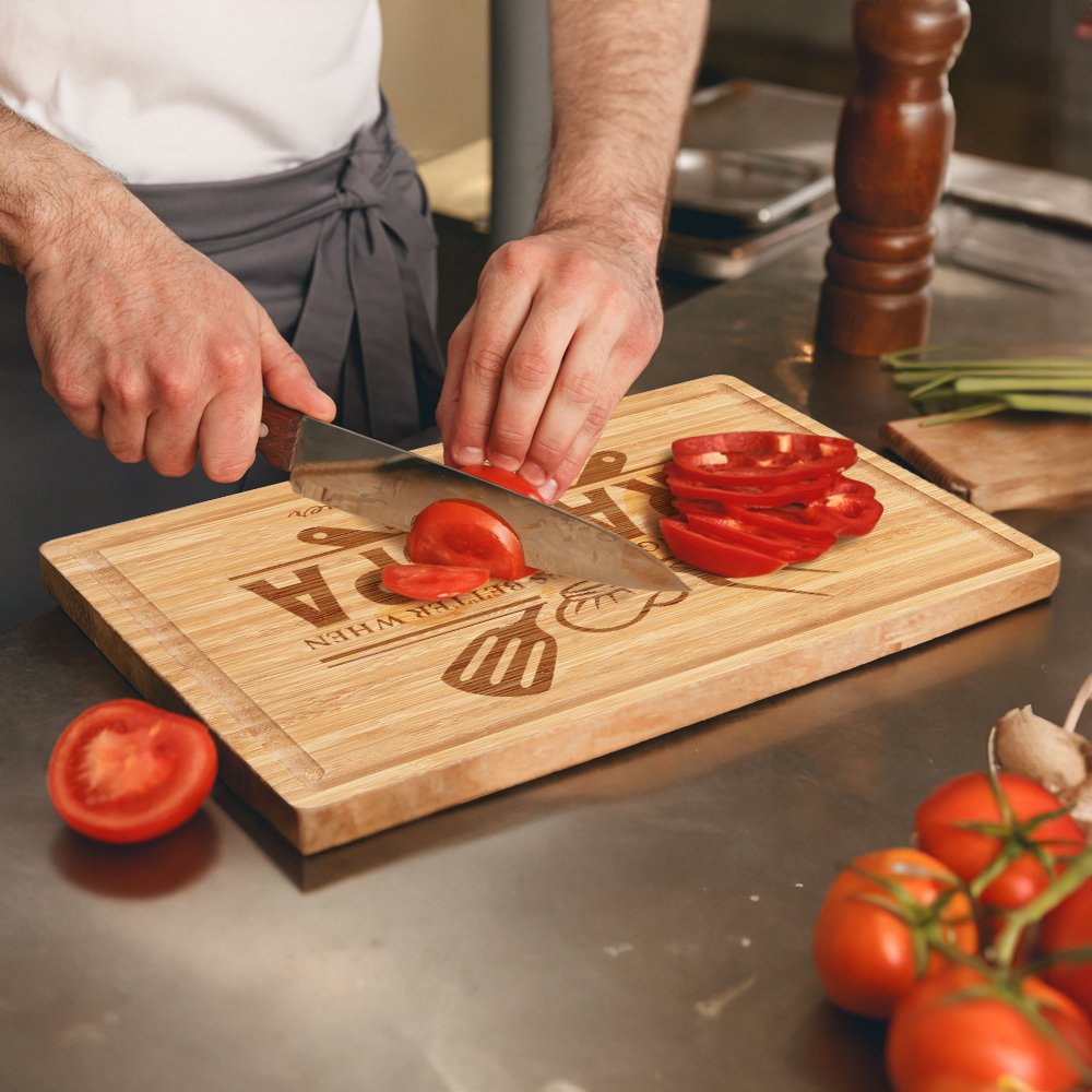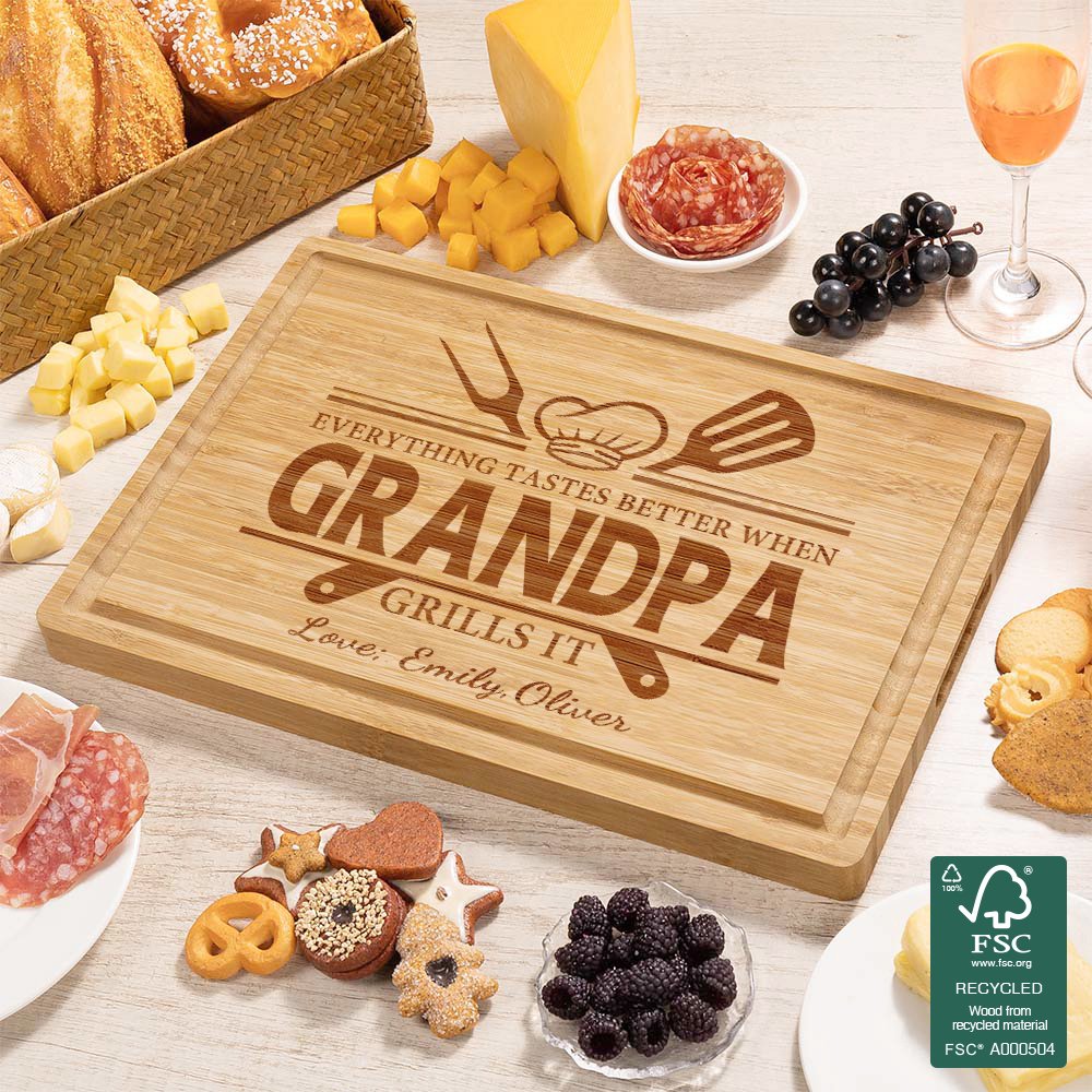 This cutting board is engraved with a pattern made up of a spatula and a fork, and the words "Everything tastes better when grandpa gills it" express appreciation. It can be customized with exclusive names and text to create a personalized and warm atmosphere.