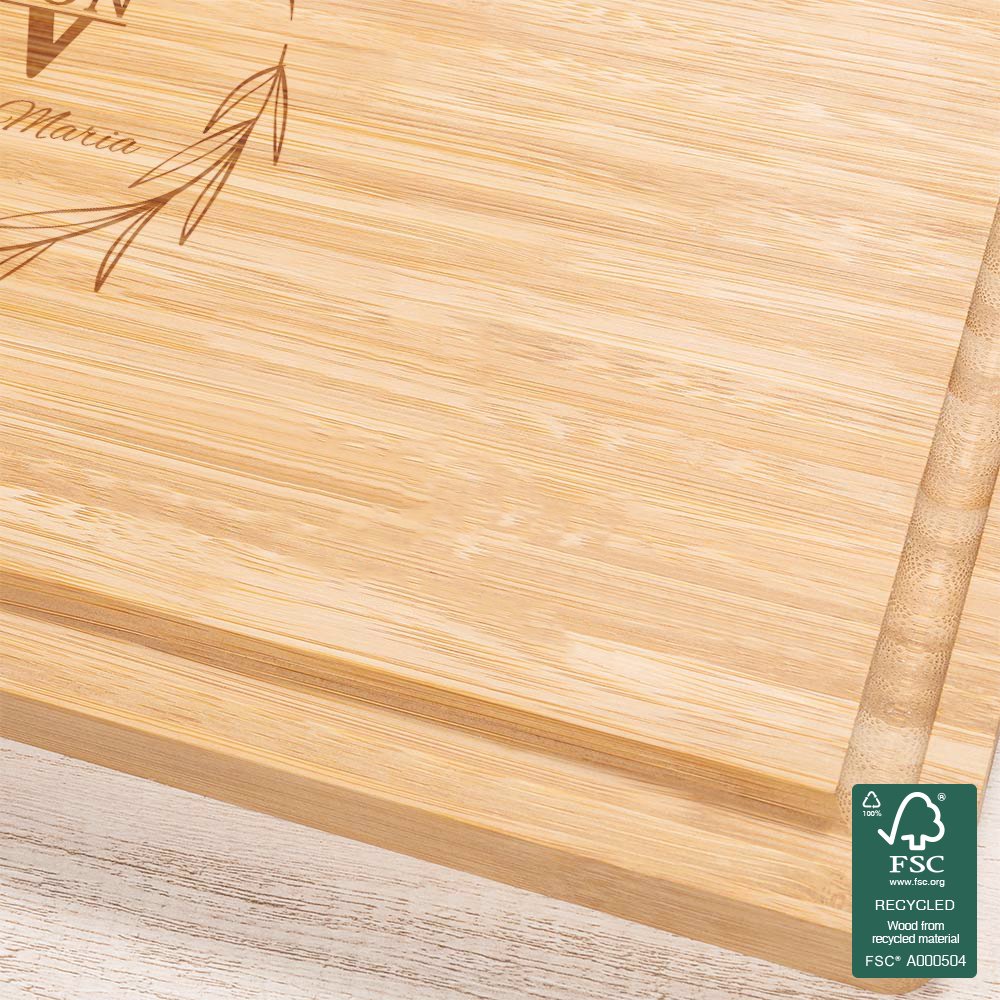 Our cutting board is crafted from high-quality bamboo, adding a natural and rustic charm. Bamboo is not only aesthetically pleasing but also highly durable, sturdy, and eco-friendly. The FSC (Forest Stewardship Council) certification ensures that the bamboo is sourced sustainably, making it perfect for environmentally-conscious consumers. The details of the cutting board are sharp and clear, adding to the overall aesthetic appeal. The smooth finish of the bamboo ensures that it is easy to clean and maintain.