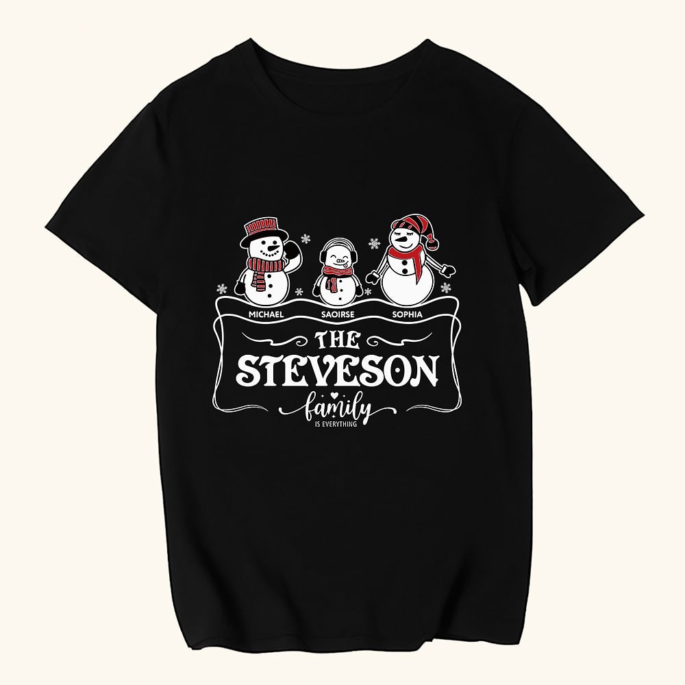 The design features a cheerful snowman motif, symbolizing the joy and playfulness of the holiday season. Each shirt and onesie is adorned with a cute, bespoke snowman character, customized with names to represent each family member. This exclusive apparel is more than just a garment, it's a symbol of unity and a perfect memento for winter gatherings.