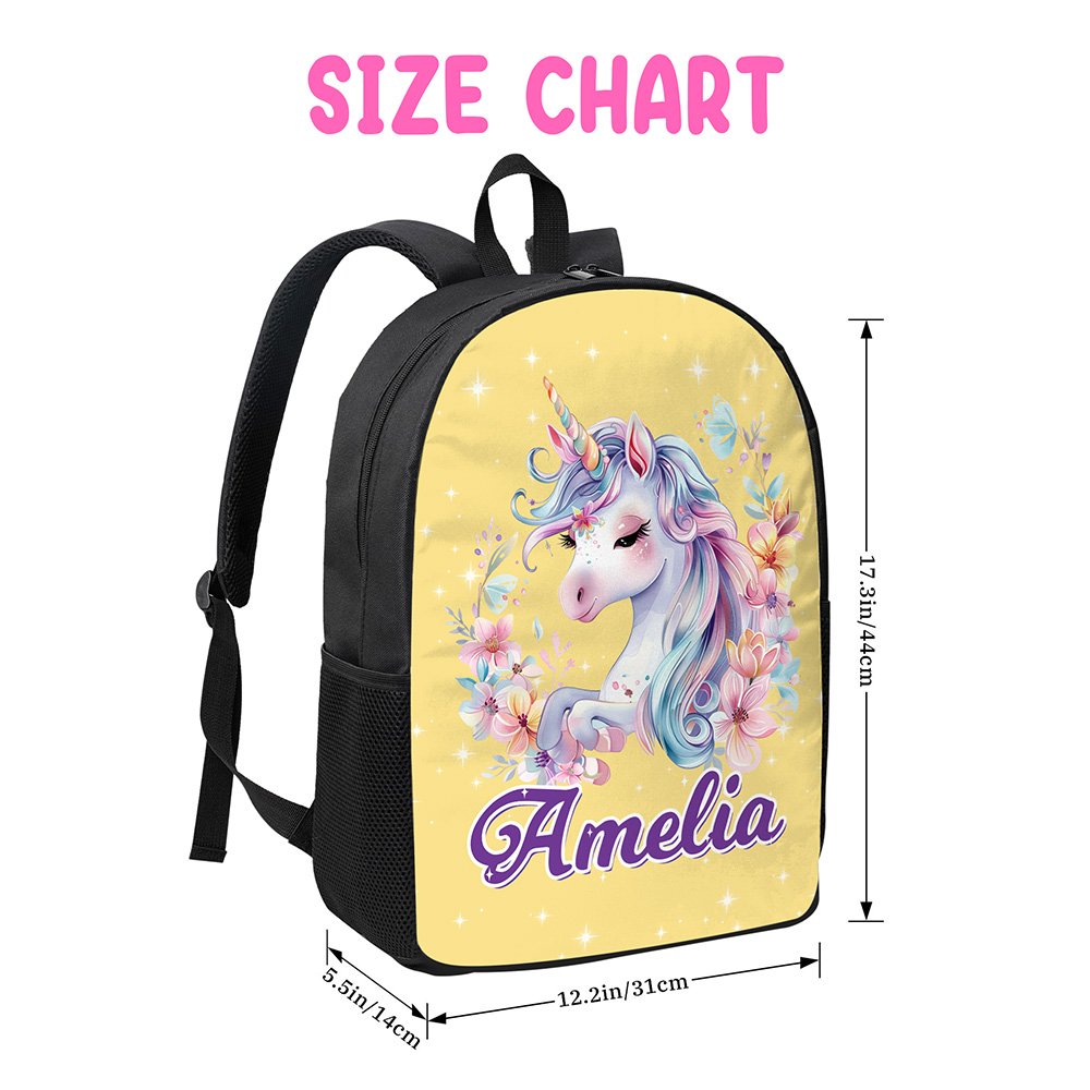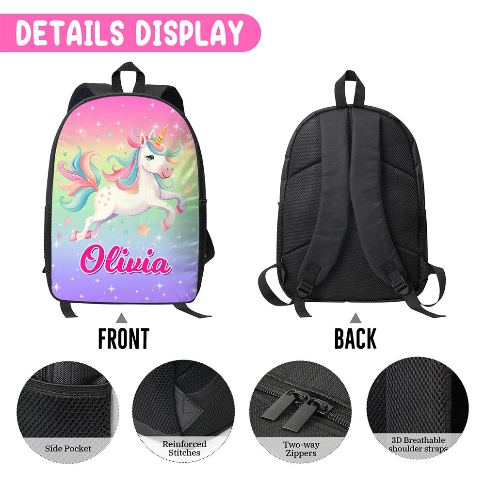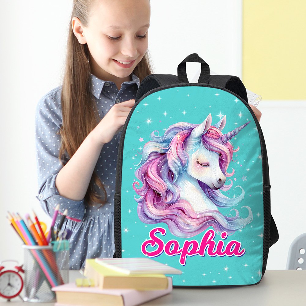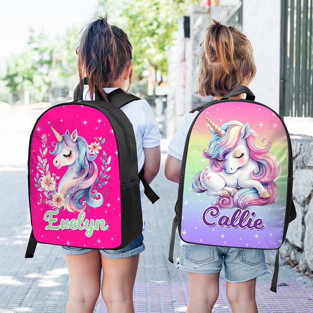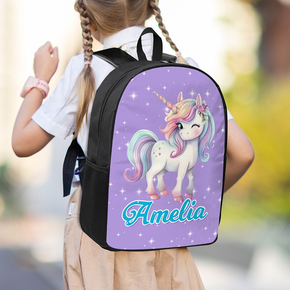 Denne ryggsekken har et fantasifullt enhjørningstema med et livlig og fantasifullt design. Fantasi-enhjørningen, som symboliserer renhet og styrke, kommer til live med sin regnbuefargede manke og halefjær, omgitt av blinkende stjerner som skaper en magisk fantasiverden. Vi tilbyr 23 ryggsekkfarger og 10 navnefarger, alle med en eventyrlig sjarm. Det tilpassede navnet gir et personlig preg som gjør at hvert barn føler seg unikt verdsatt.