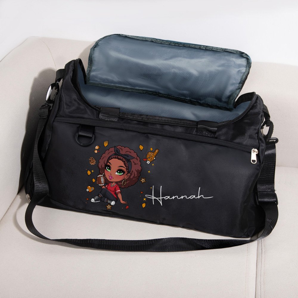 This travel bag features a stylish football girl as the design element, with a background of fallen leaves and pine cones, showing the spirit of sport and an intense autumn atmosphere. You can write your name on the bag to create a travel accessory that is unique to you.