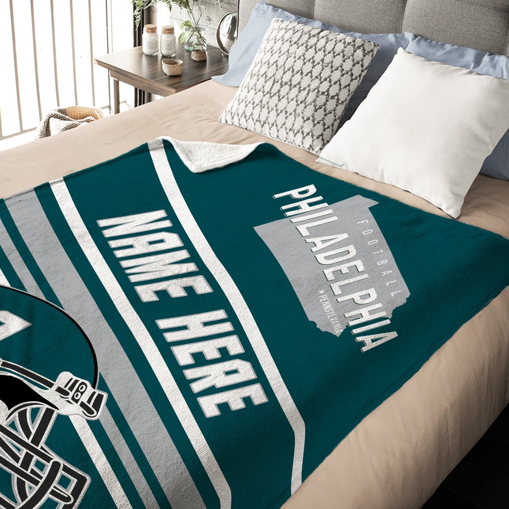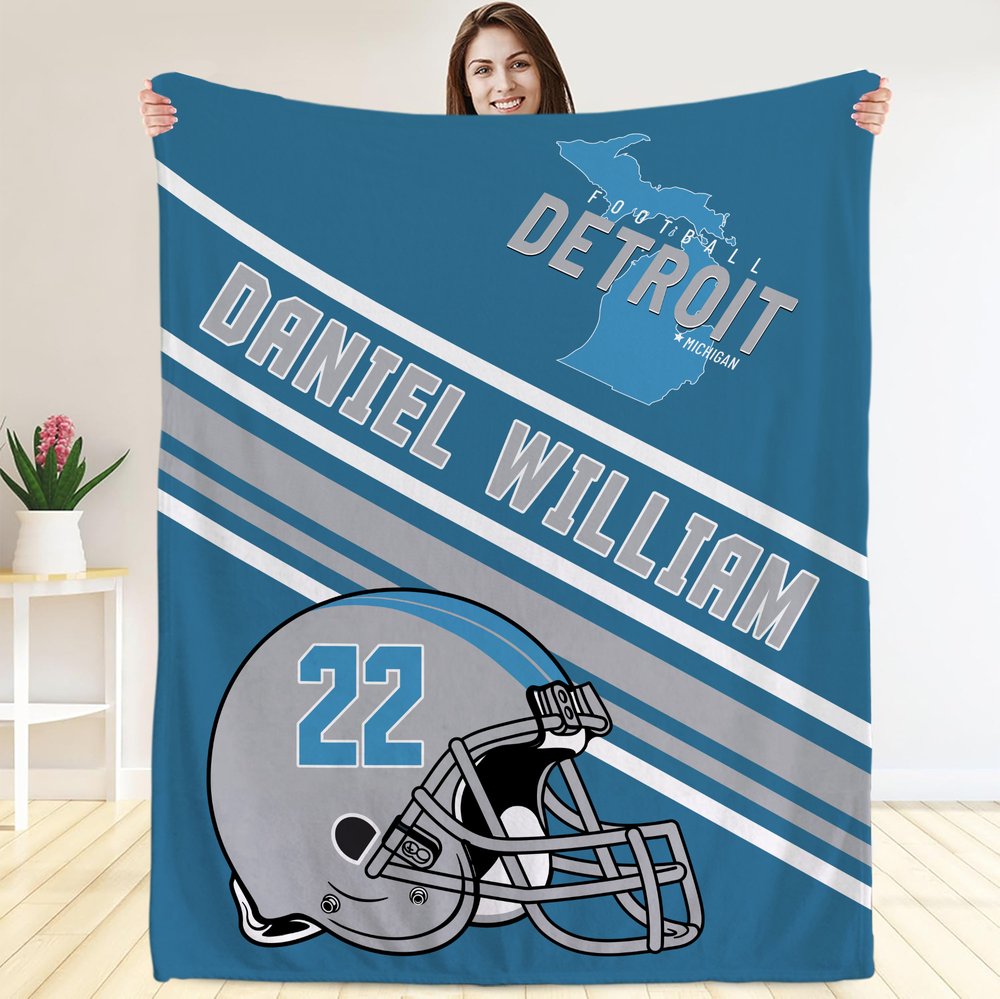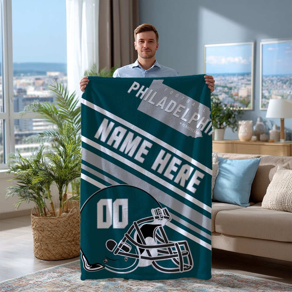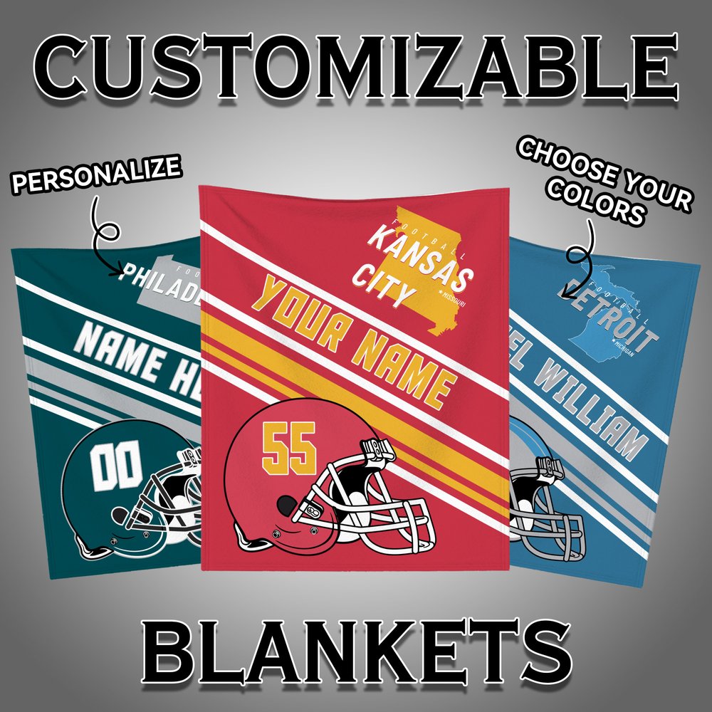 The vibrant designs and custom details create a spirited, masculine style that’s perfect for football fans who want to showcase their team loyalty while staying warm and comfortable. You can choose between two styles: map design (with a city map element, e.g., Kansas City) and No Map Design. Adding a custom name, a jersey number, and a team name turns the blanket into a unique, team-spirited keepsake.