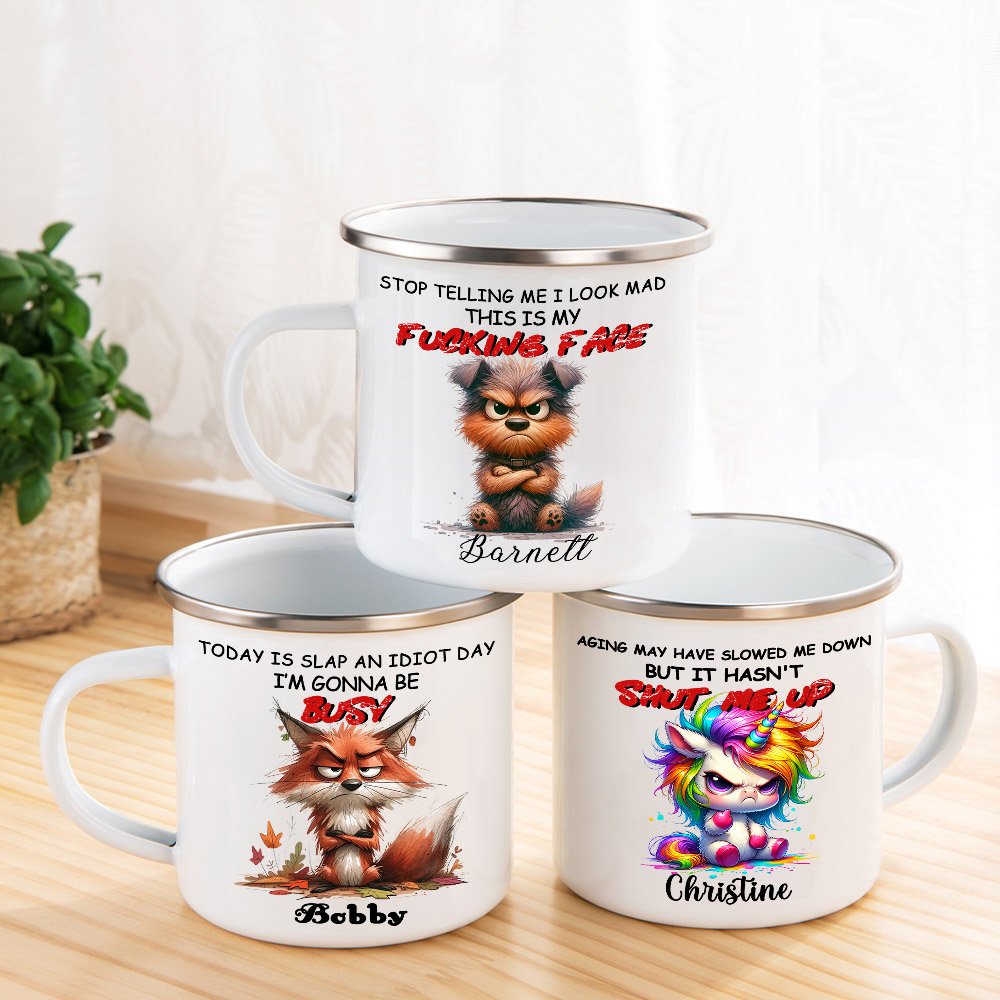 This enamel mug attracts attention with its unique design. Each mug is printed with cartoon images of different animals, such as foxes, zebras, monkeys, etc., with humorous and sharp texts, such as "Stop telling me I look mad this is my fucking face", etc., which adds fun. You can also customize your name on the mug to show your unique personality.