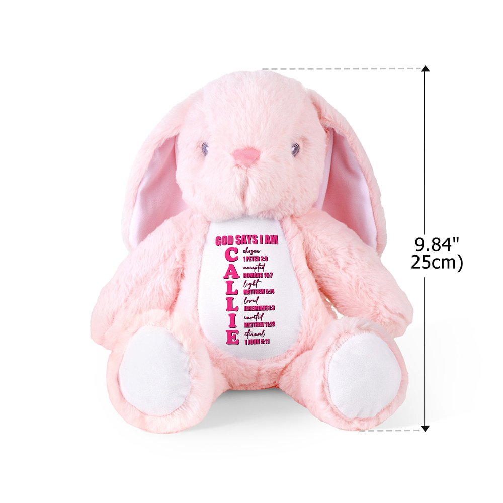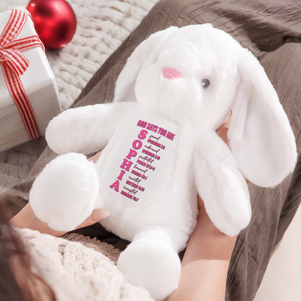 Based on a cute bunny doll, the doll cleverly incorporates biblical elements, creating a playful yet authentic feel. Customizable with your child's name, the doll transcends the boundaries of mere toys and becomes a personal companion. The warm and inviting design evokes a religious theme while appealing to children's aesthetic preferences, instantly capturing their attention.