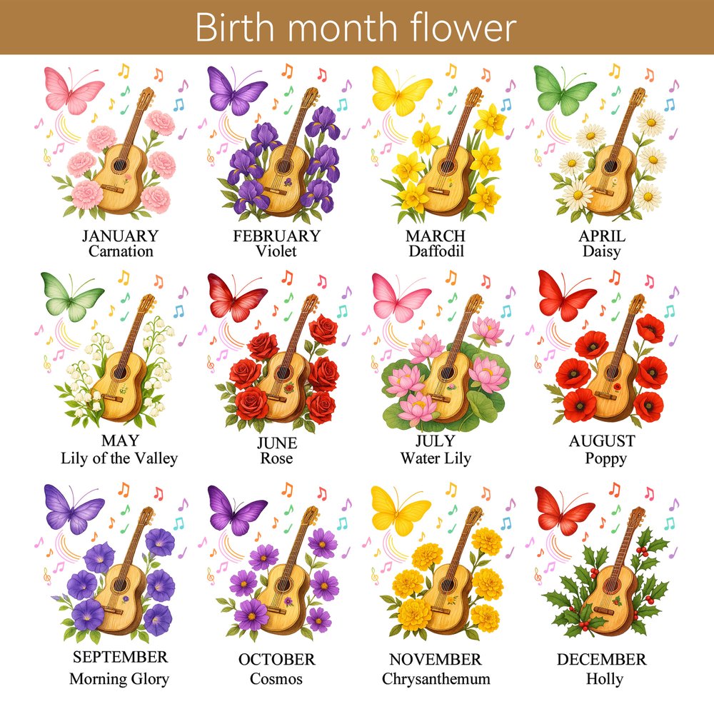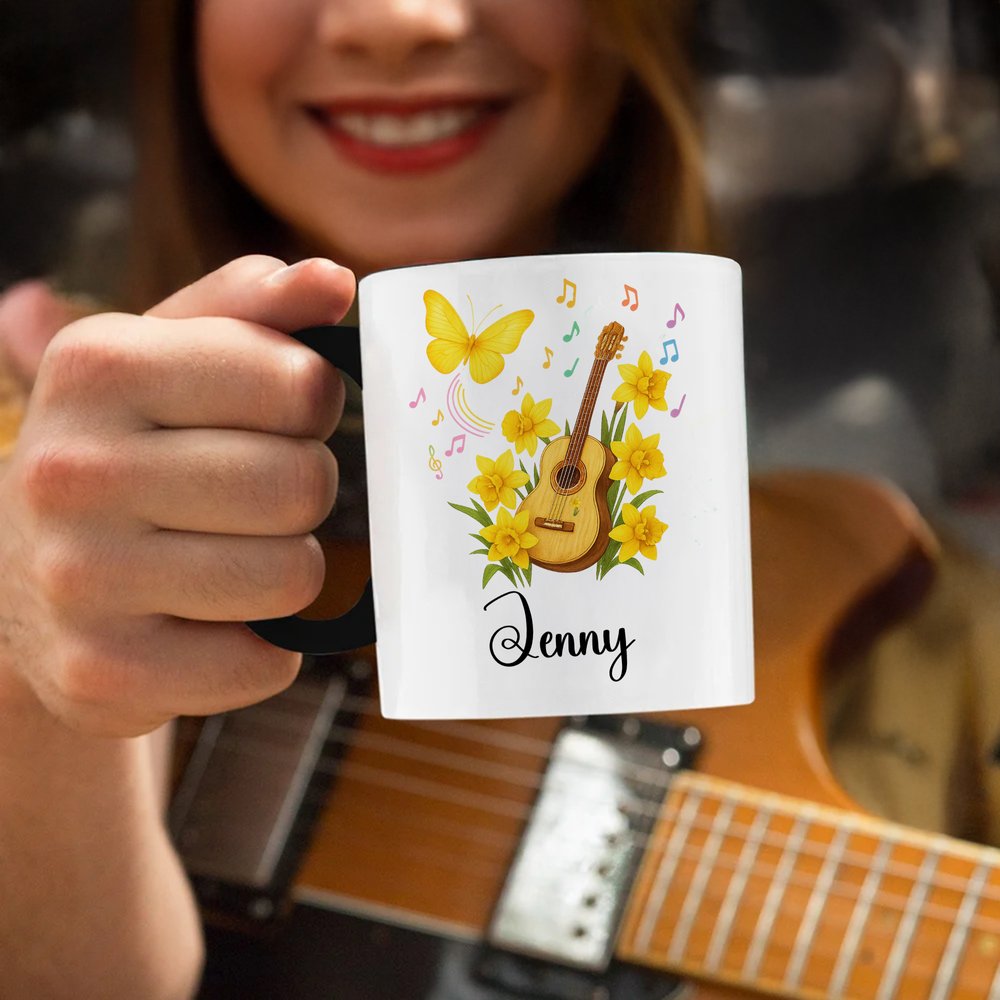 This ceramic mug features a guitar, a birthday flower, a butterfly, and musical symbols as its core design elements. The birth flower corresponding to your birth month gracefully unfolds across the mug, interspersed with vibrant butterflies and dancing musical symbols, seemingly blending the freedom of music with the gentle beauty of nature. The overall style is artistic and poetic, evoking an artistic spirit through these elements without overly elaborate decorations. Customizable with your own name, the mug bears a personal touch while showcasing a love of music and life.